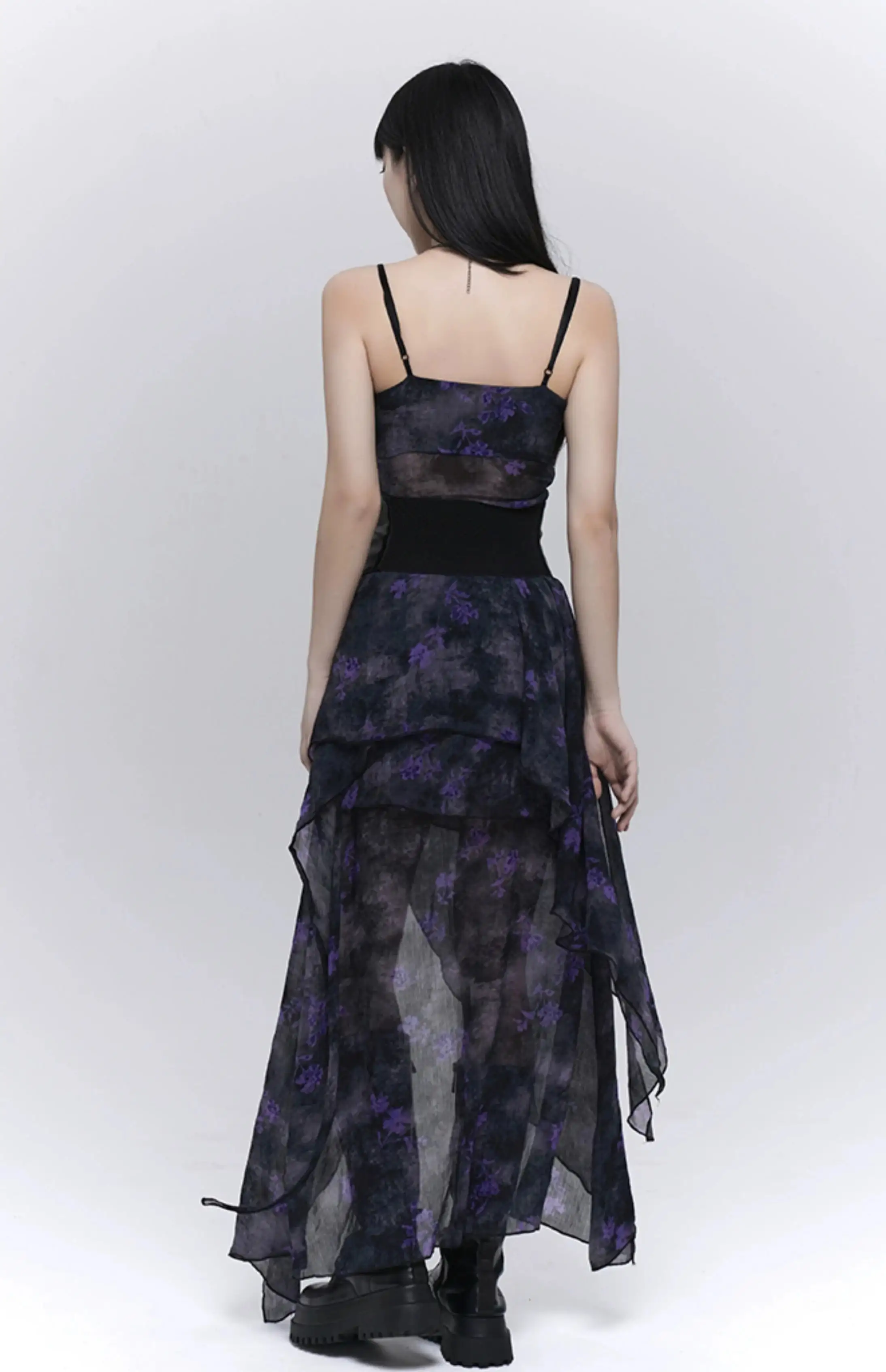 Make a statement in the Asymmetric Hem Floral Sheer Overlay Dress, where edgy meets elegance.