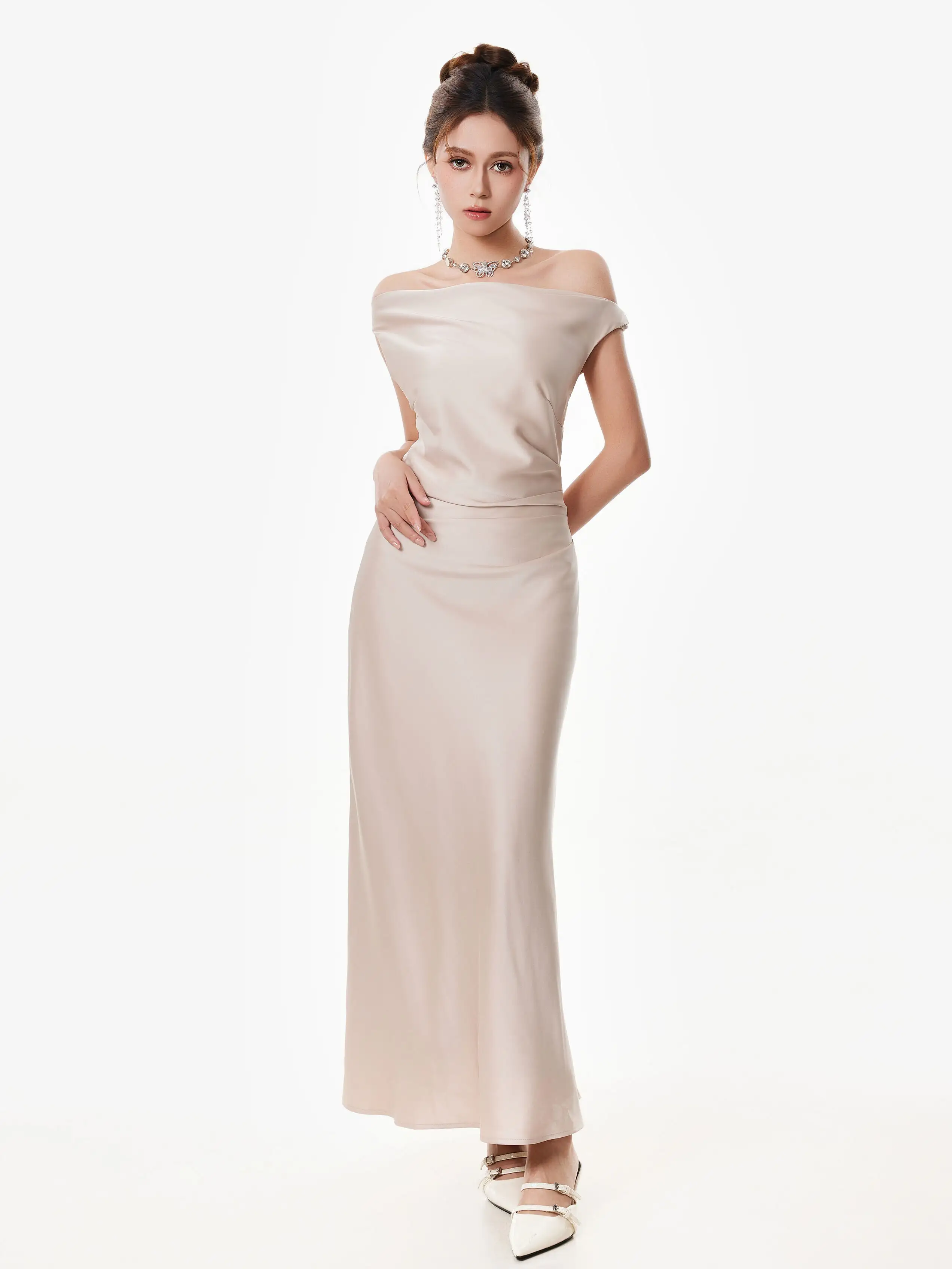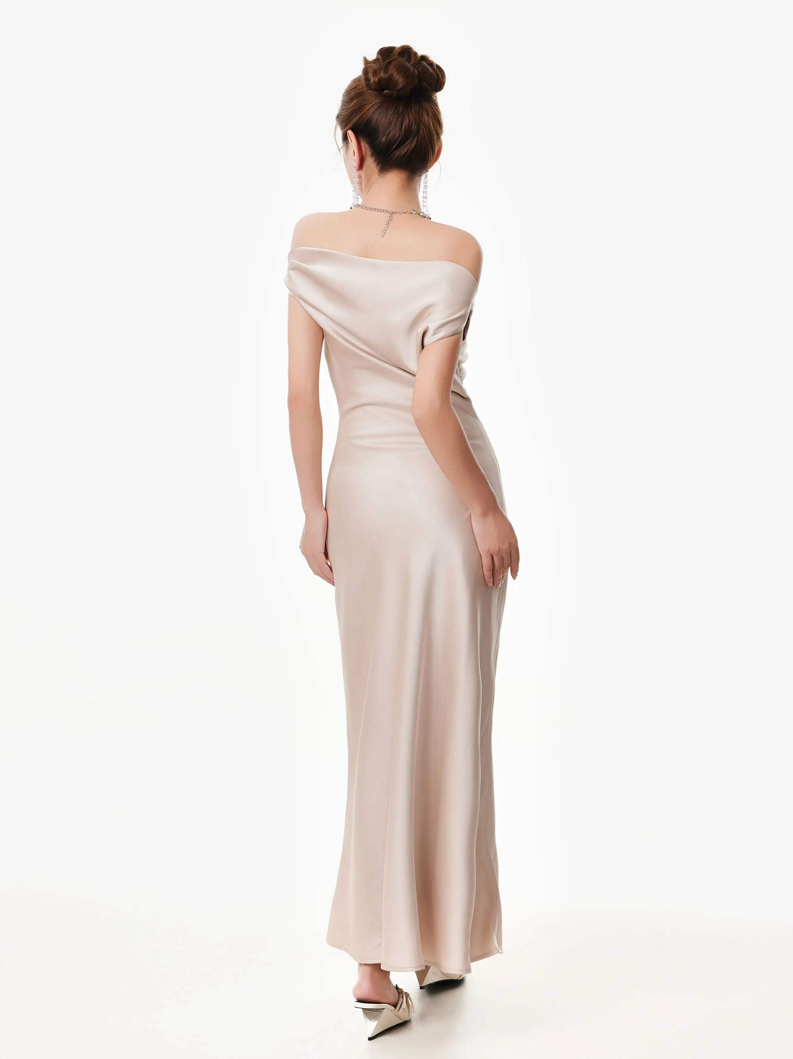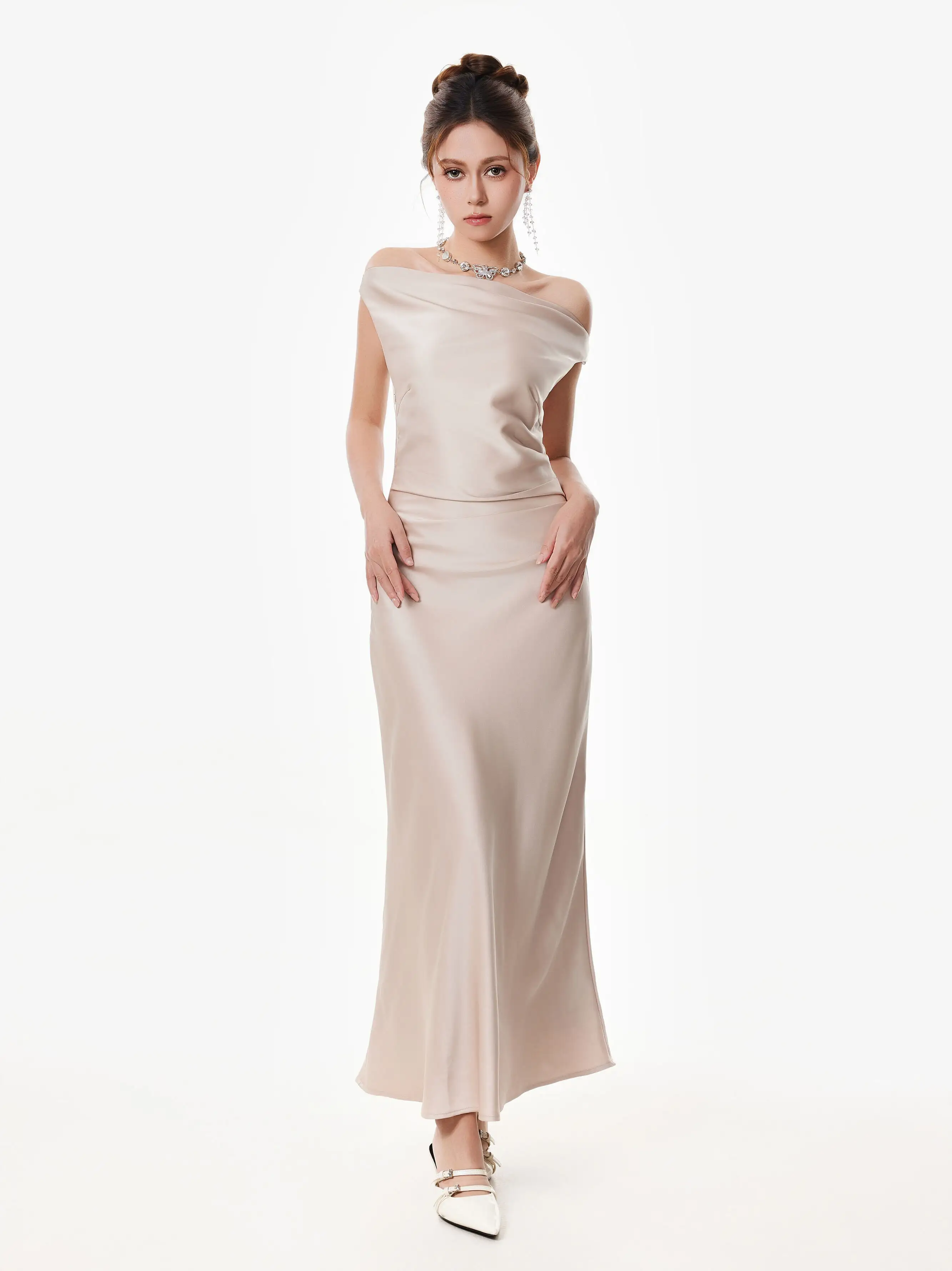 The asymmetrical one-shoulder satin maxi dress brings just enough edge to elevate an effortless look. With its clean lines and minimal silhouette, it strikes a rare balance between modern allure and soft elegance.