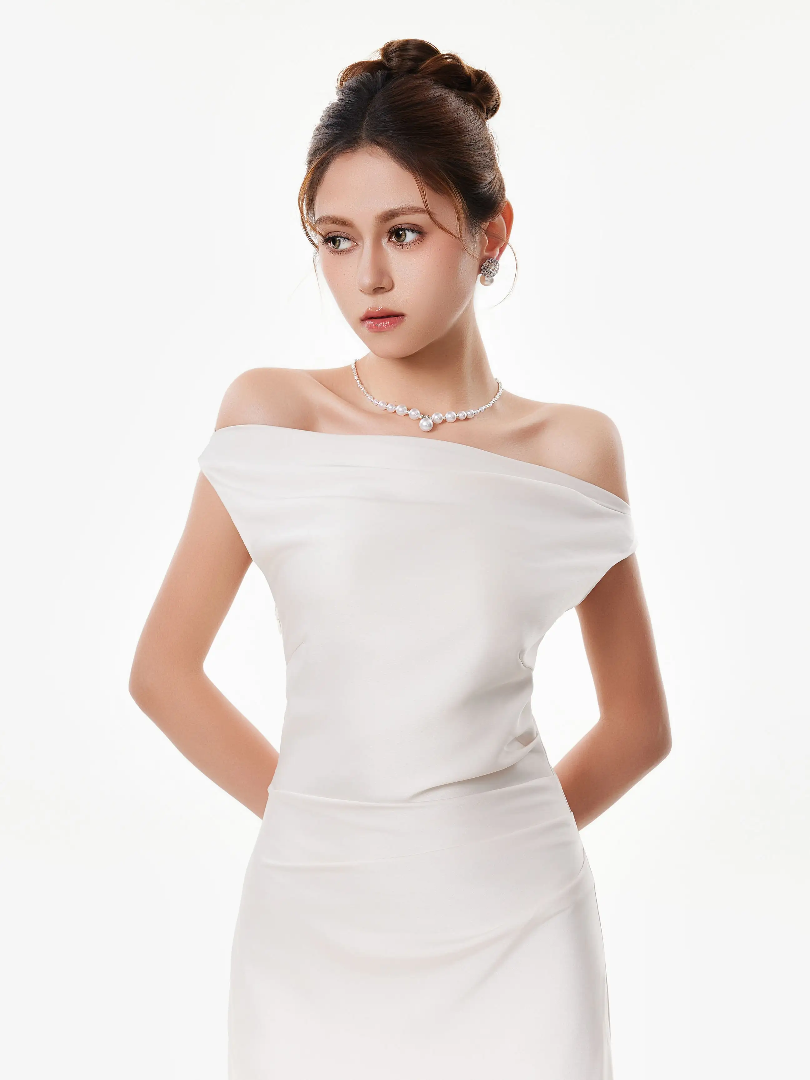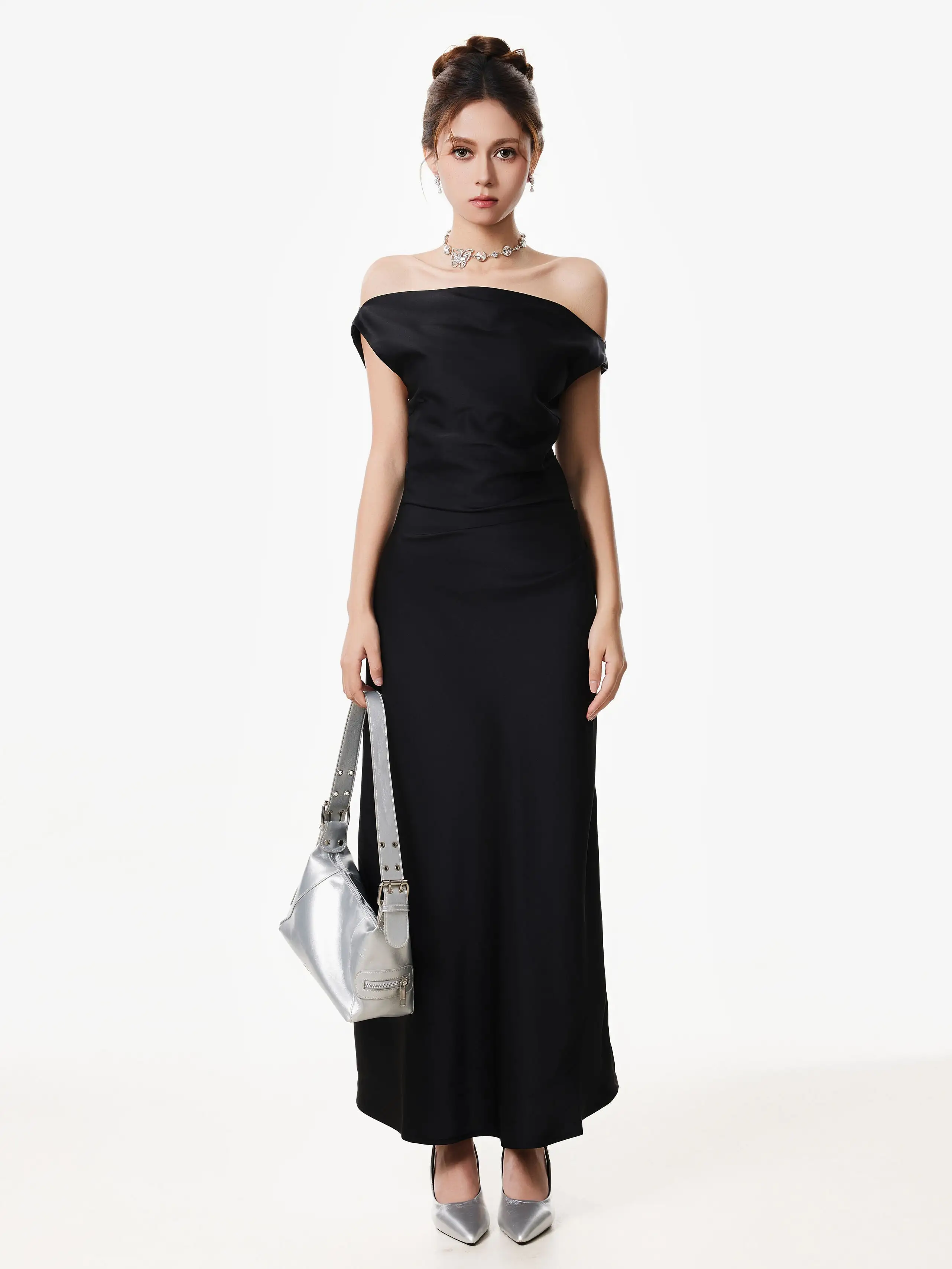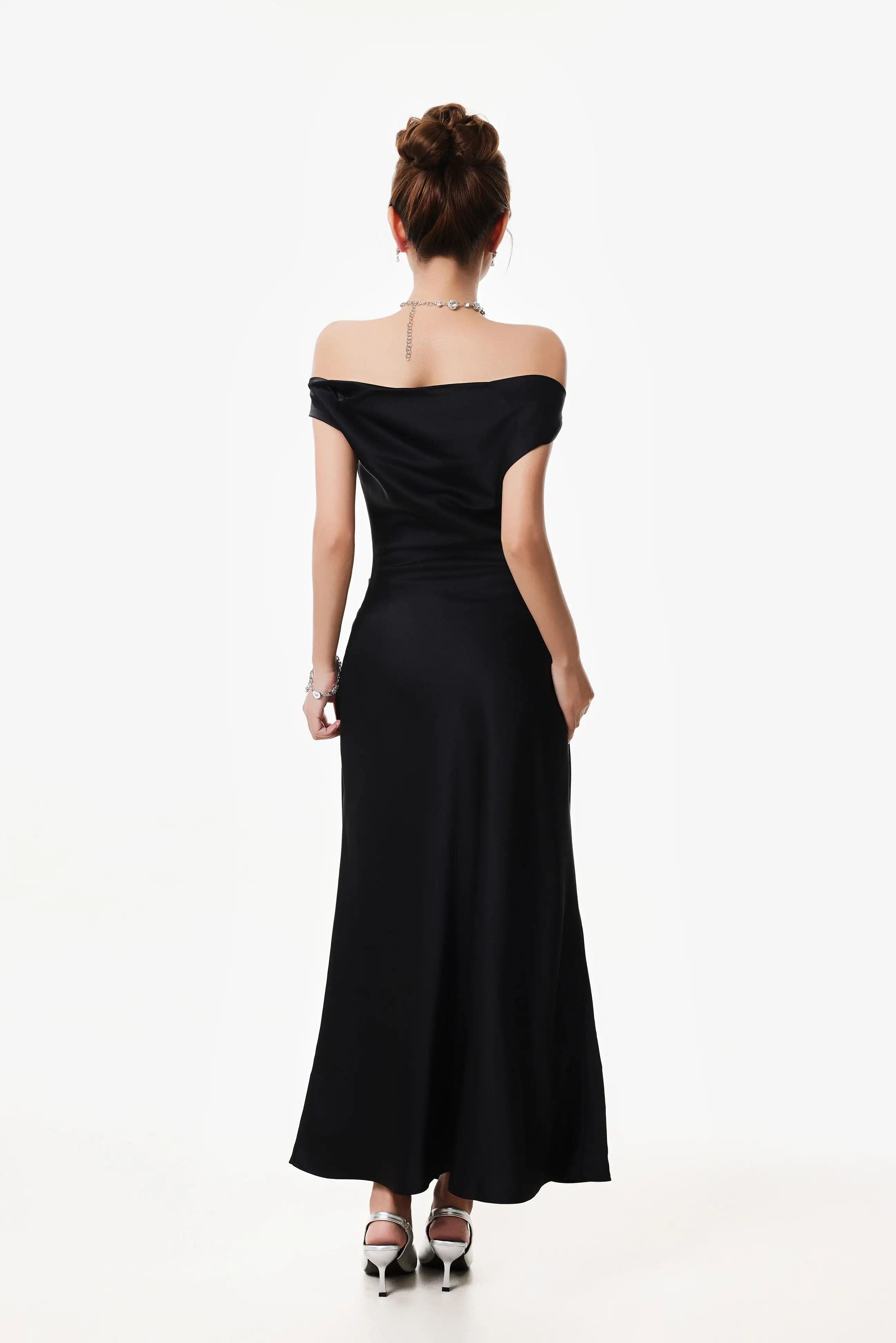 The asymmetrical one-shoulder satin maxi dress brings just enough edge to elevate an effortless look. With its clean lines and minimal silhouette, it strikes a rare balance between modern allure and soft elegance.