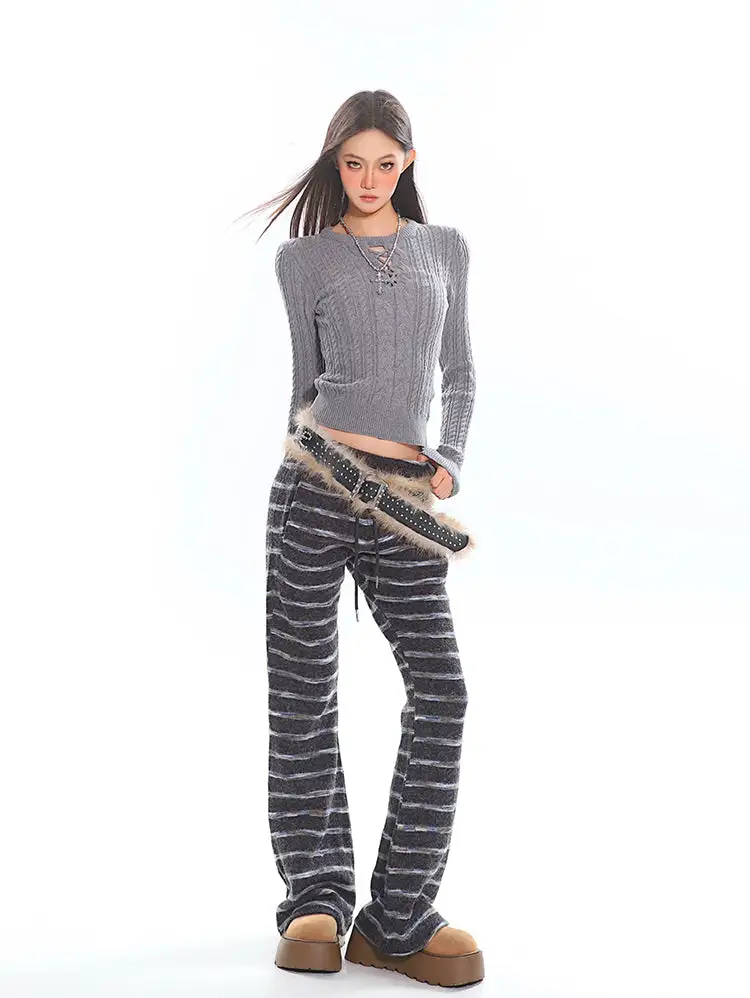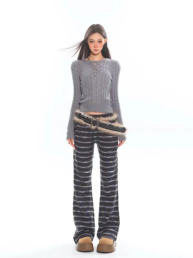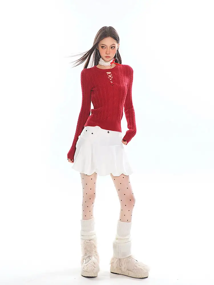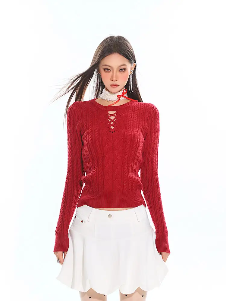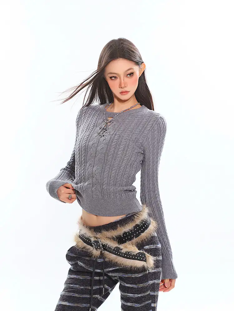 Its artful design combines classic texture with a modern edge, making it a standout piece that blends comfort with attitude. The intricate cable-knit pattern and cross-tie cutout neckline create a chic fusion of vintage charm and contemporary allure. Crafted from soft, breathable knit, the sweater molds effortlessly to your silhouette, offering both warmth and freedom of movement. Perfect for cooler days or layering under your favorite jacket, this sweater is your go-to for style that feels as good as it looks.