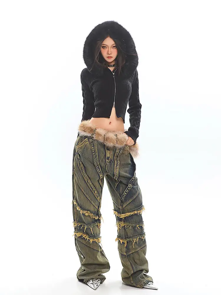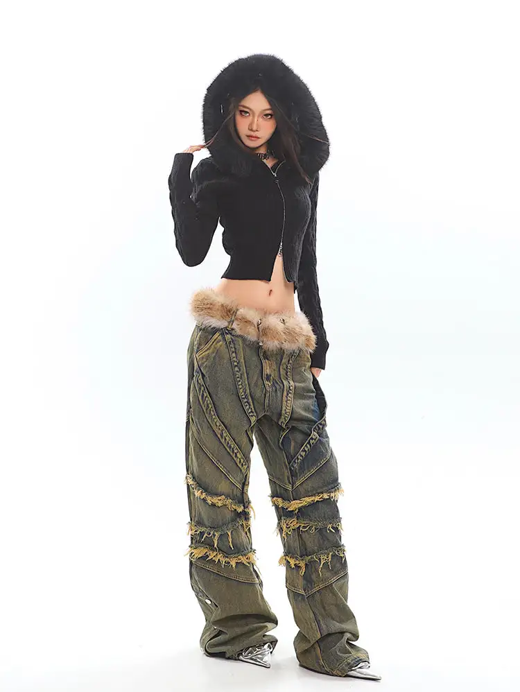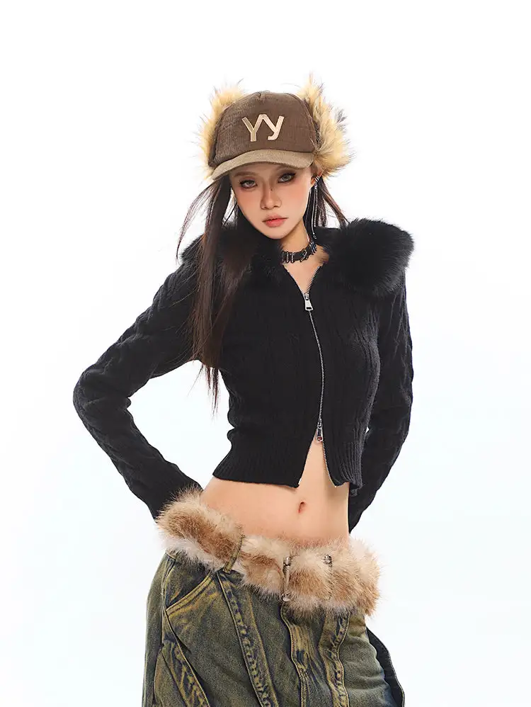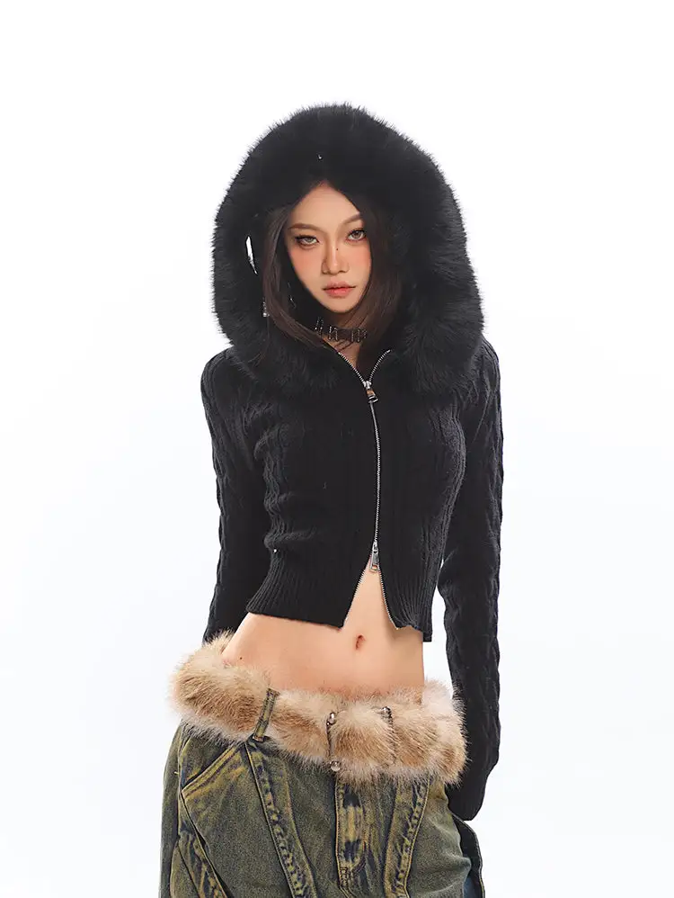 Stay effortlessly cool with the Faux Fur Hoodie Cable Knit Cropped Zip Jacket, a perfect mix of edgy and chic elements that elevate your wardrobe.