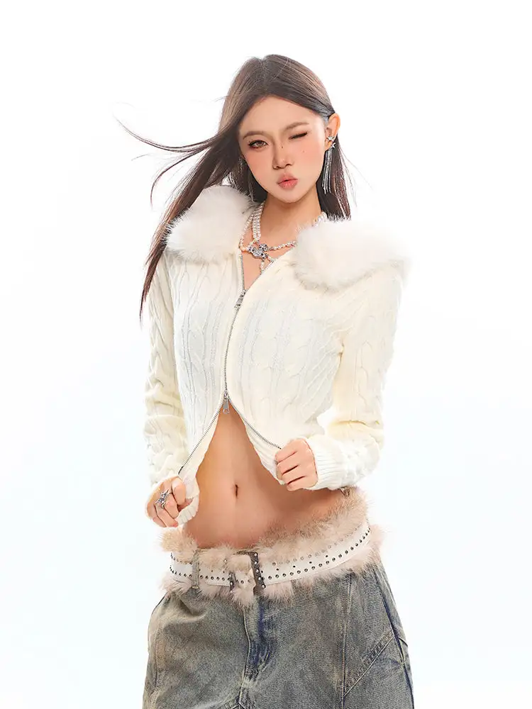 Faux Fur Hoodie Cable Knit Cropped Zip Jacket