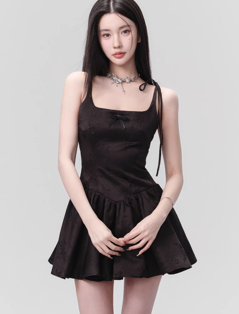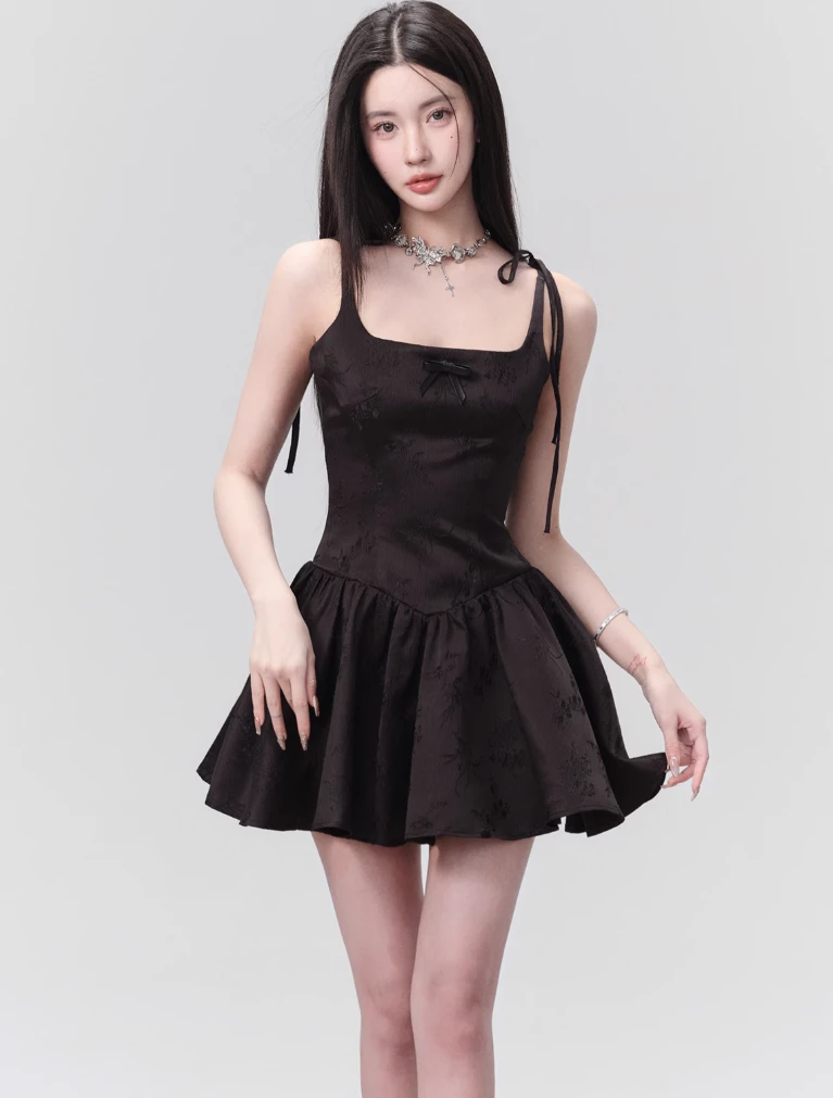 A subtle semi-gloss finish and a removable bow detail at the chest create a balance of edge and elegance without doing too much. This dress is made with a dimensional jacquard fabric that catches light with a refined sheen, while stretchy lining ensures a close yet comfortable fit. The flared skirt brings movement, and the tie-up straps add flexibility and shape.