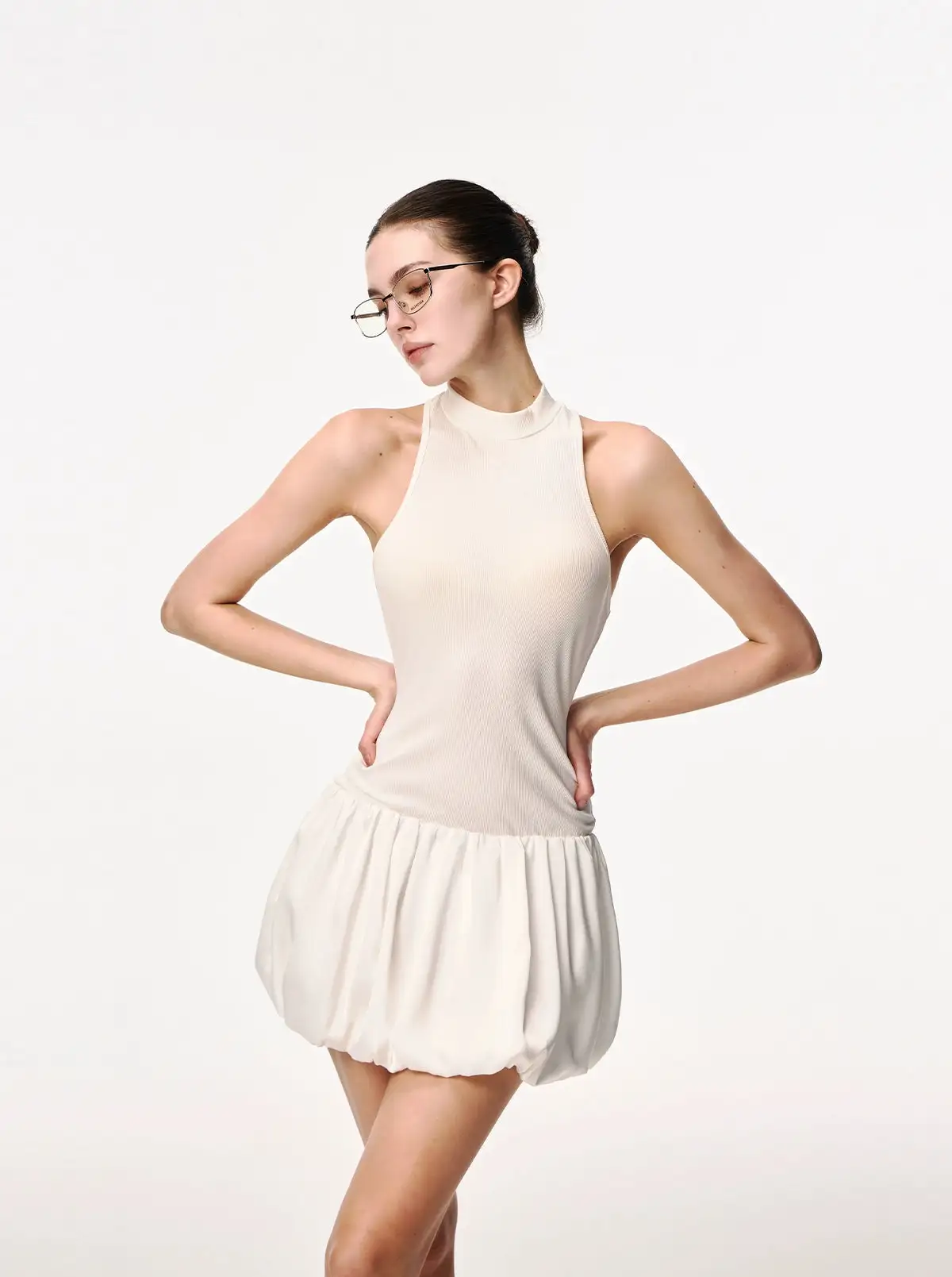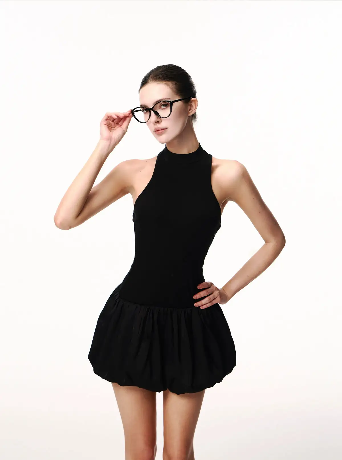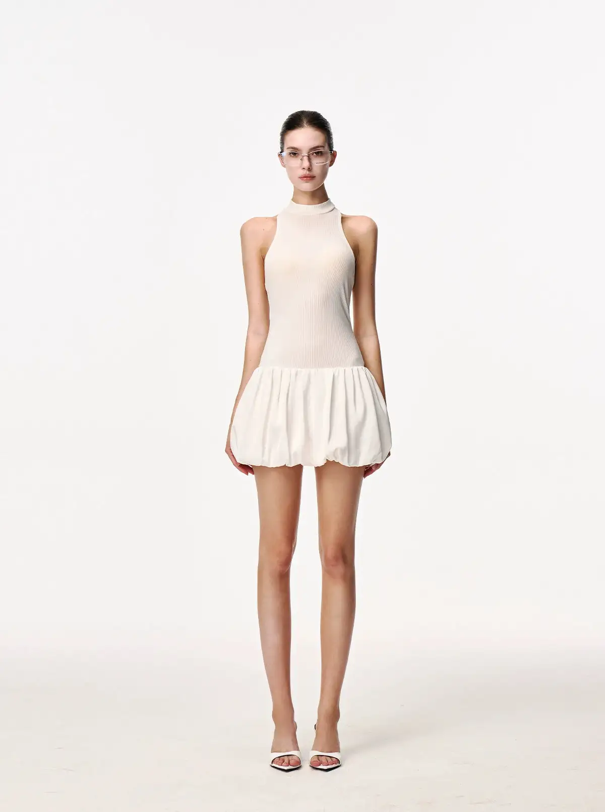 A halter neckline and open back define this mini dress with a confident silhouette and subtle edge. Designed with a bubble hem skirt for added volume, it balances structure with softness in all the right places.