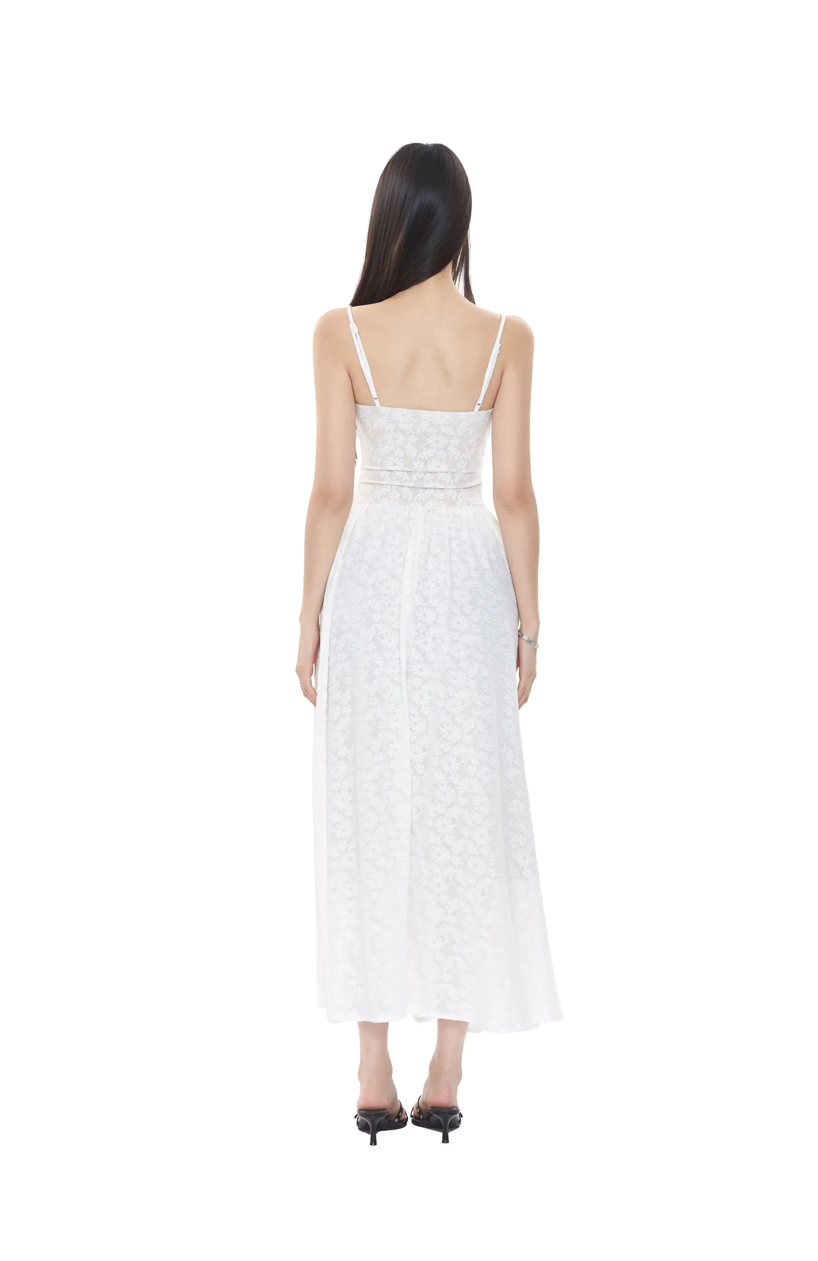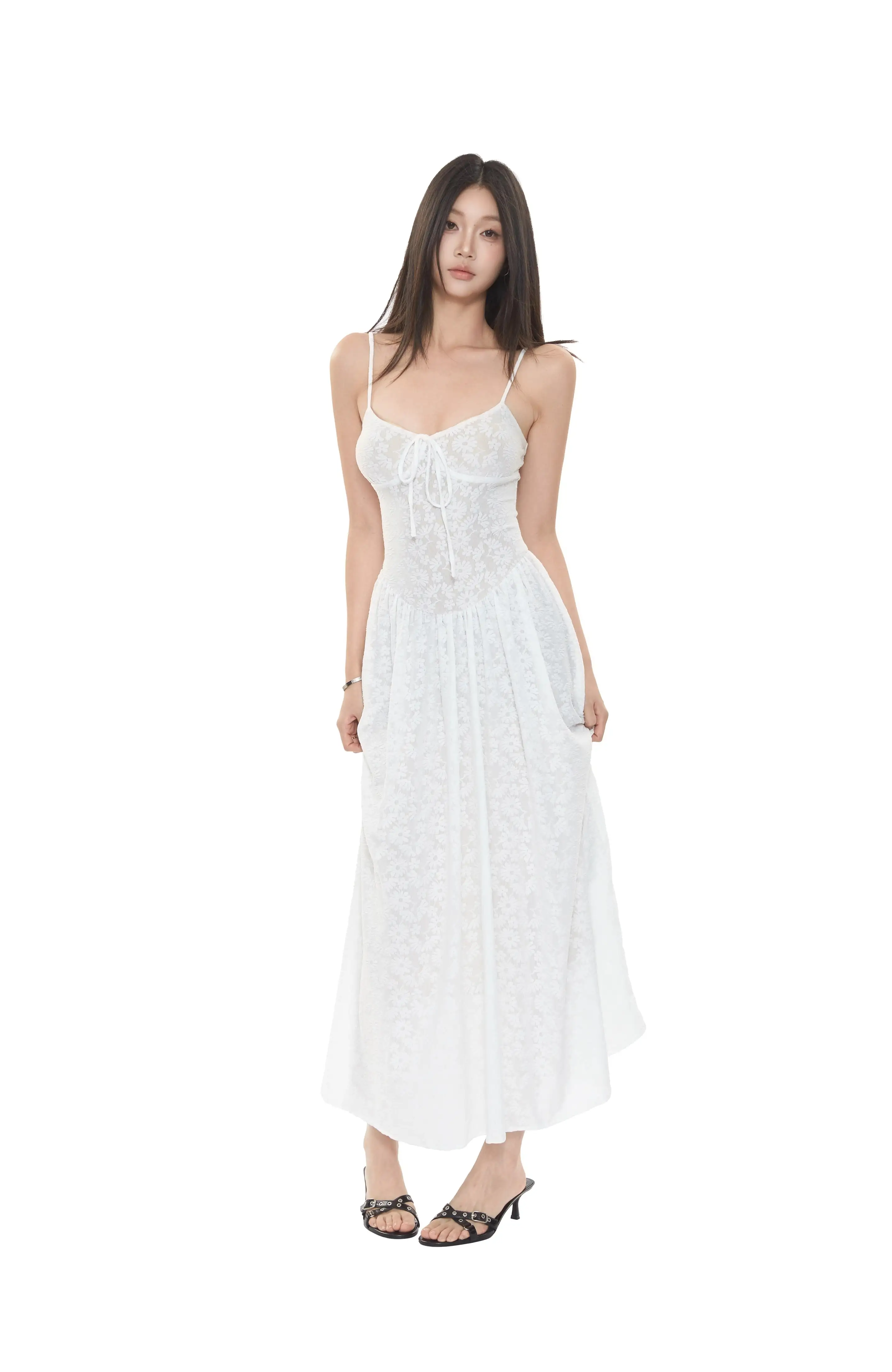 Made with a soft lace overlay and subtle embroidery throughout, the dress features a flattering V-neckline and a naturally contoured, slightly structured silhouette. Adjustable spaghetti straps allow for a customized fit, while the full-length drop brings ease and movement. A minimal tie detail at the chest adds just enough visual interest without trying too hard.