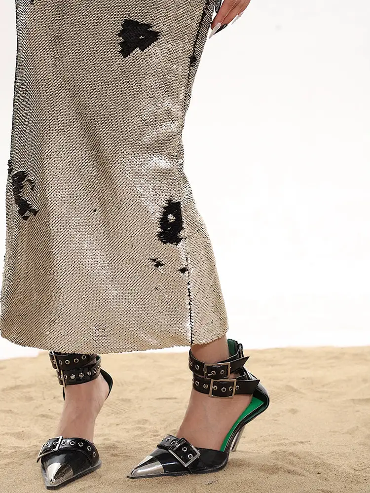 A dazzling addition to any event, this dress promises a lasting impression. Made with premium sequin fabric, this slip dress design exudes elegance with a side slit that adds a touch of daring sophistication. The unique link chain shoulder straps offer a modern twist, combining edgy style with a hint of nonchalance. It's the perfect balance of fashion-forward design and timeless allure.