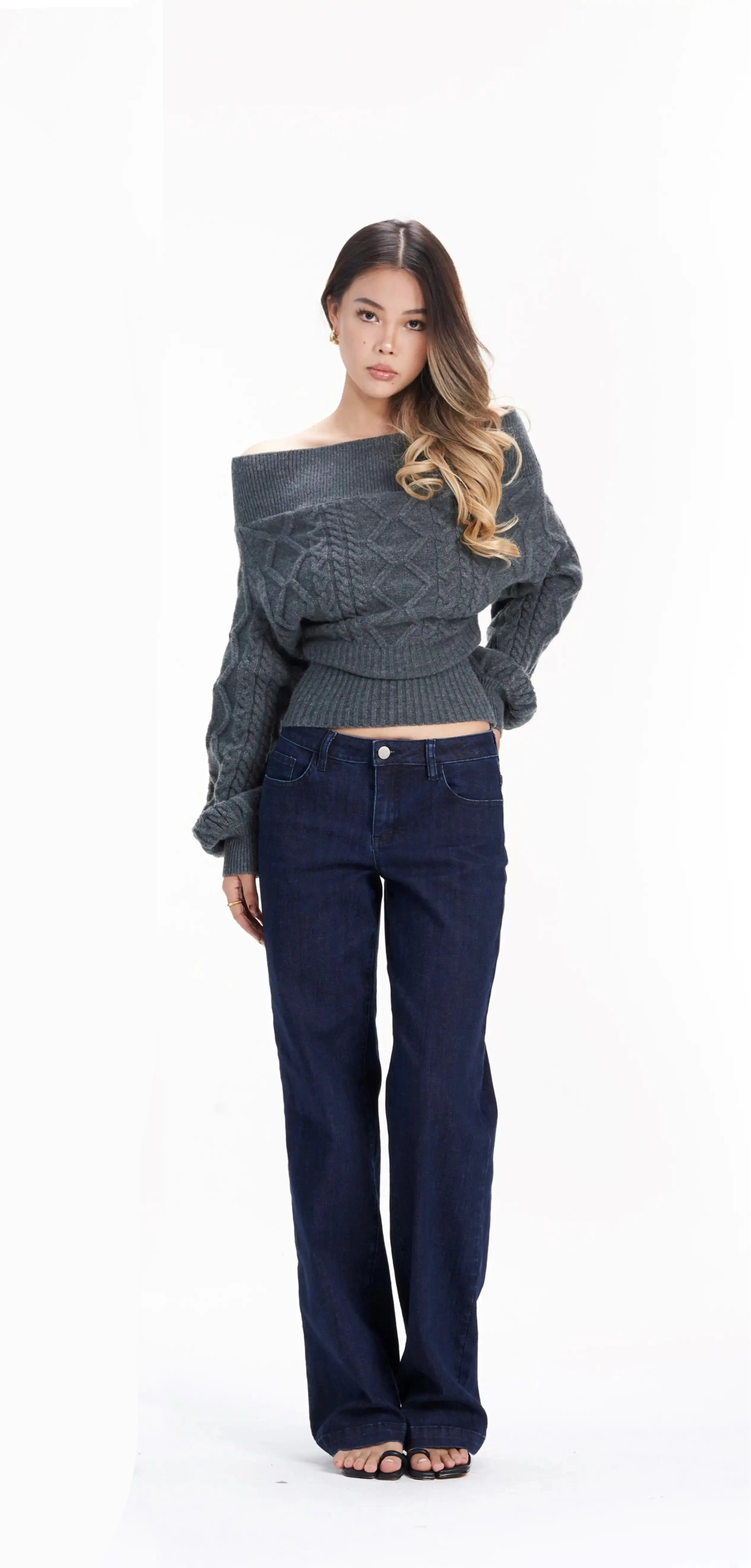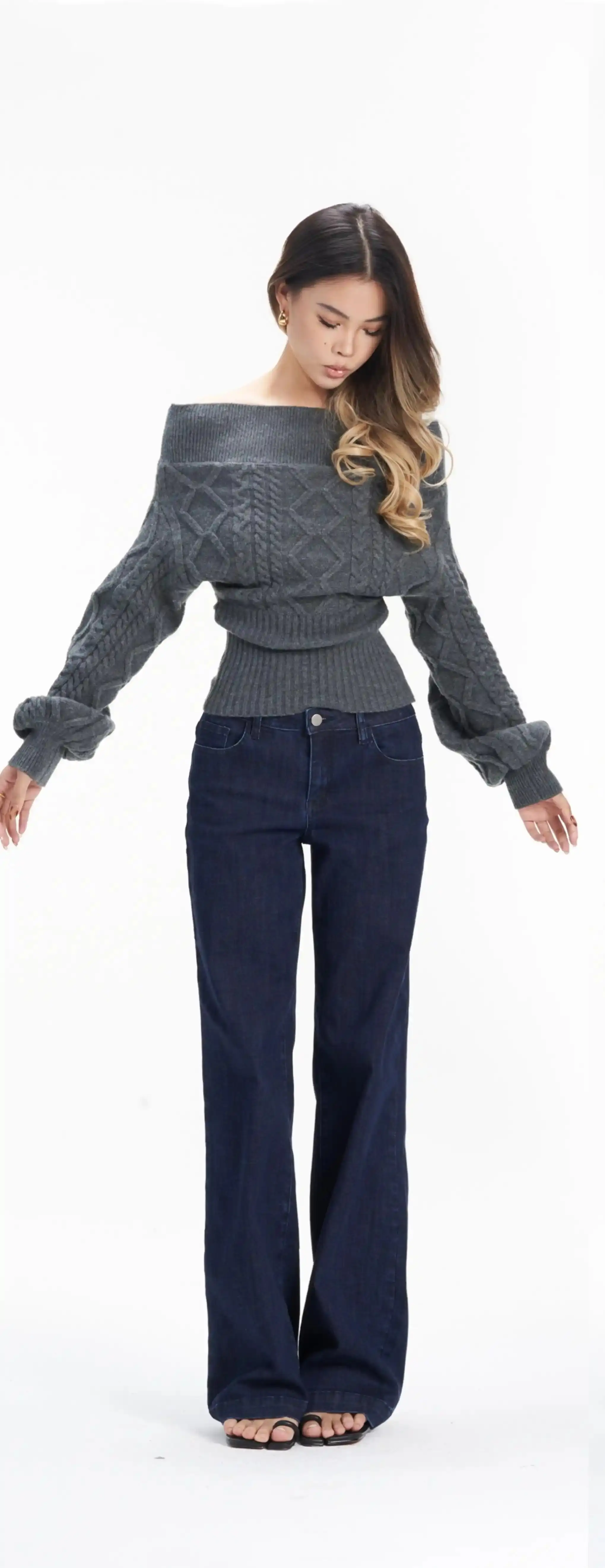 Thick cable knit texture wraps the body in warmth while the cinched waist brings a confident silhouette. Crafted from a dense yarn blend, it features a Z-pattern weave that adds subtle dimension and a unique finish. The balloon sleeves and wide neckline give it a slouchy, relaxed attitude that still feels thoughtful and intentional.