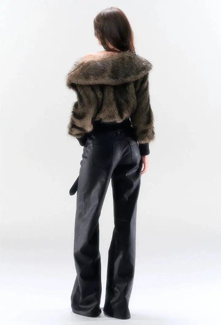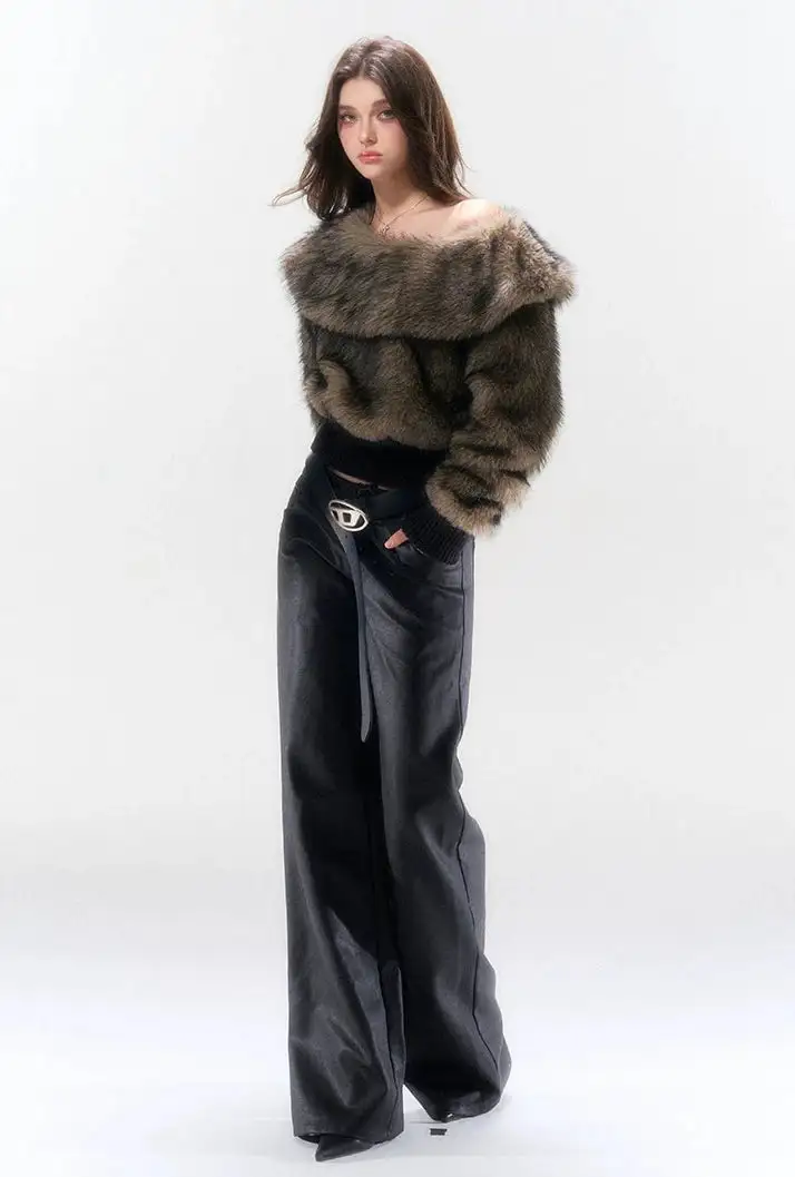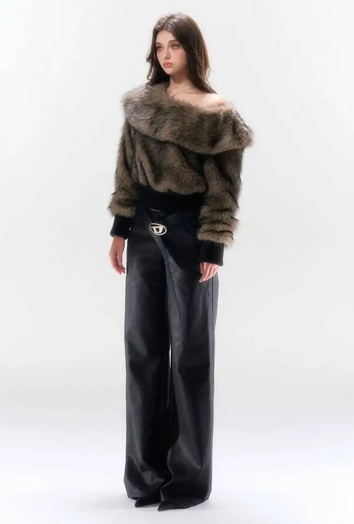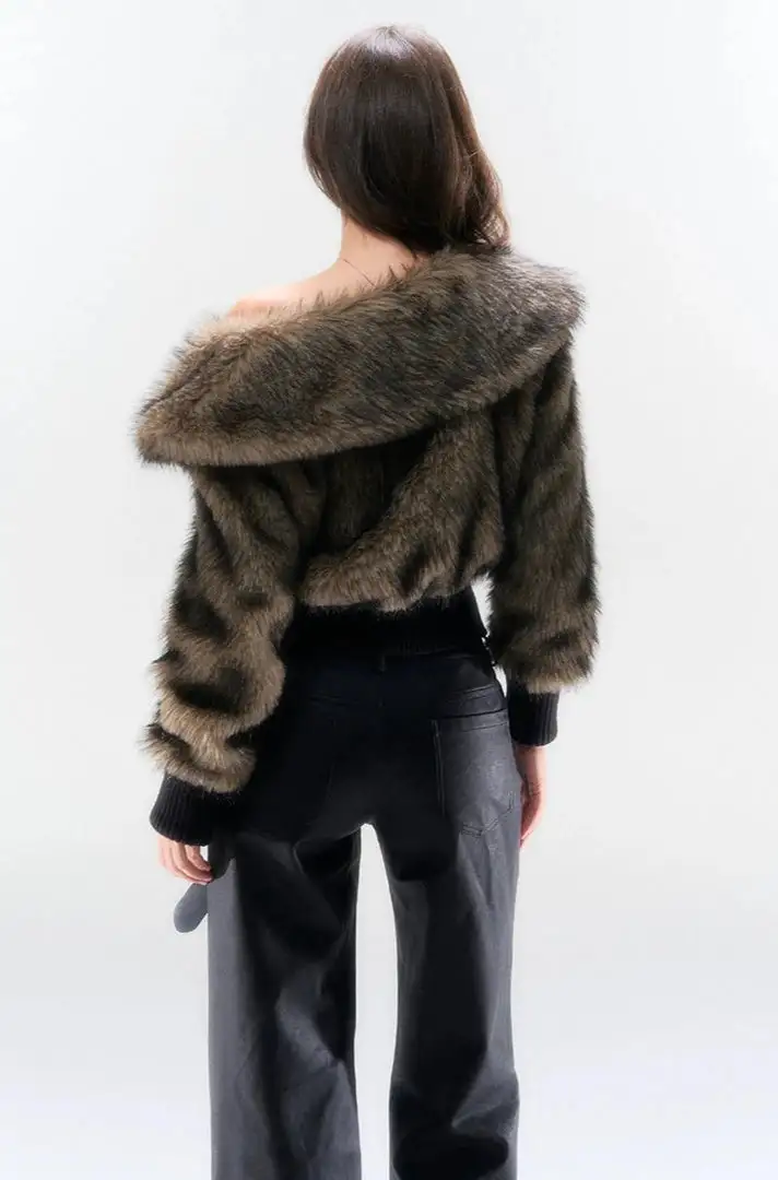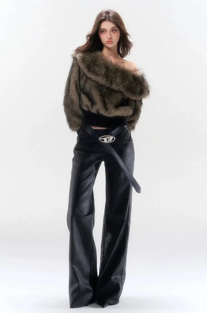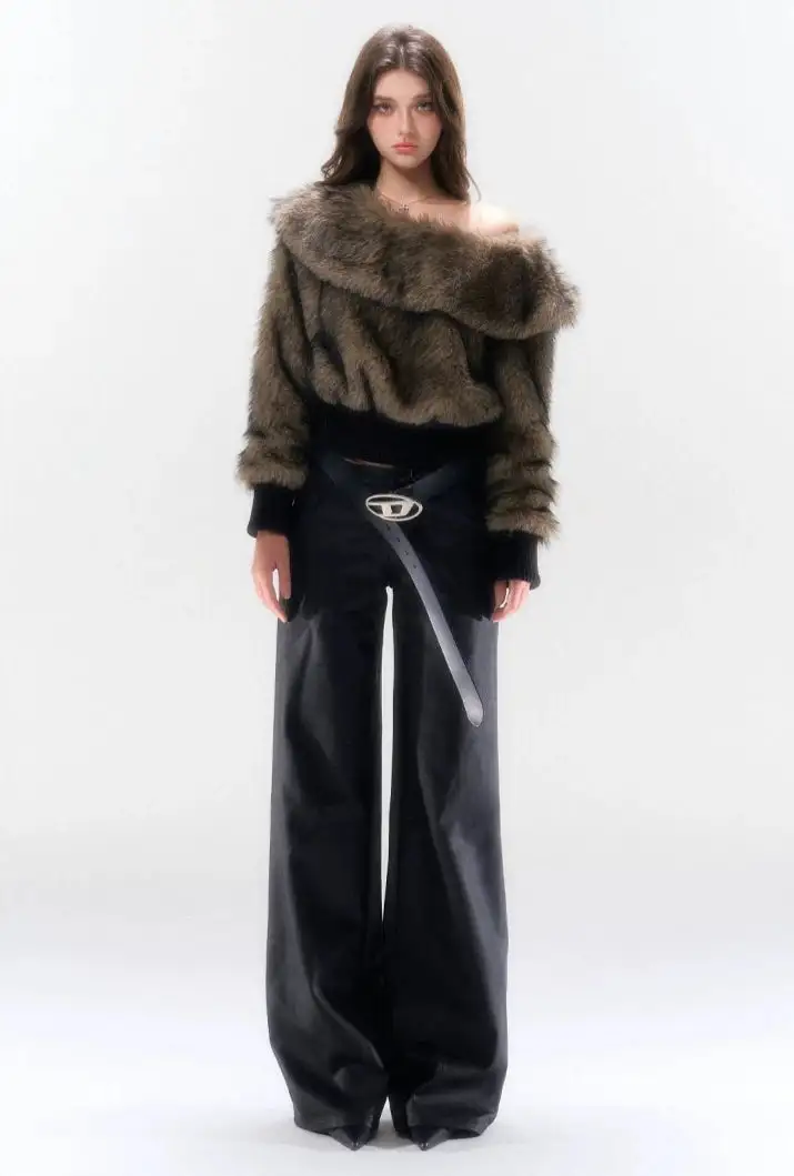 Made from high-quality imitation fur, this piece features a unique one-shoulder design, providing an edgy twist to the classic sweater. The combination of ribbed cuffs and a soft, short silhouette ensures both warmth and a touch of sophisticated nonchalance.