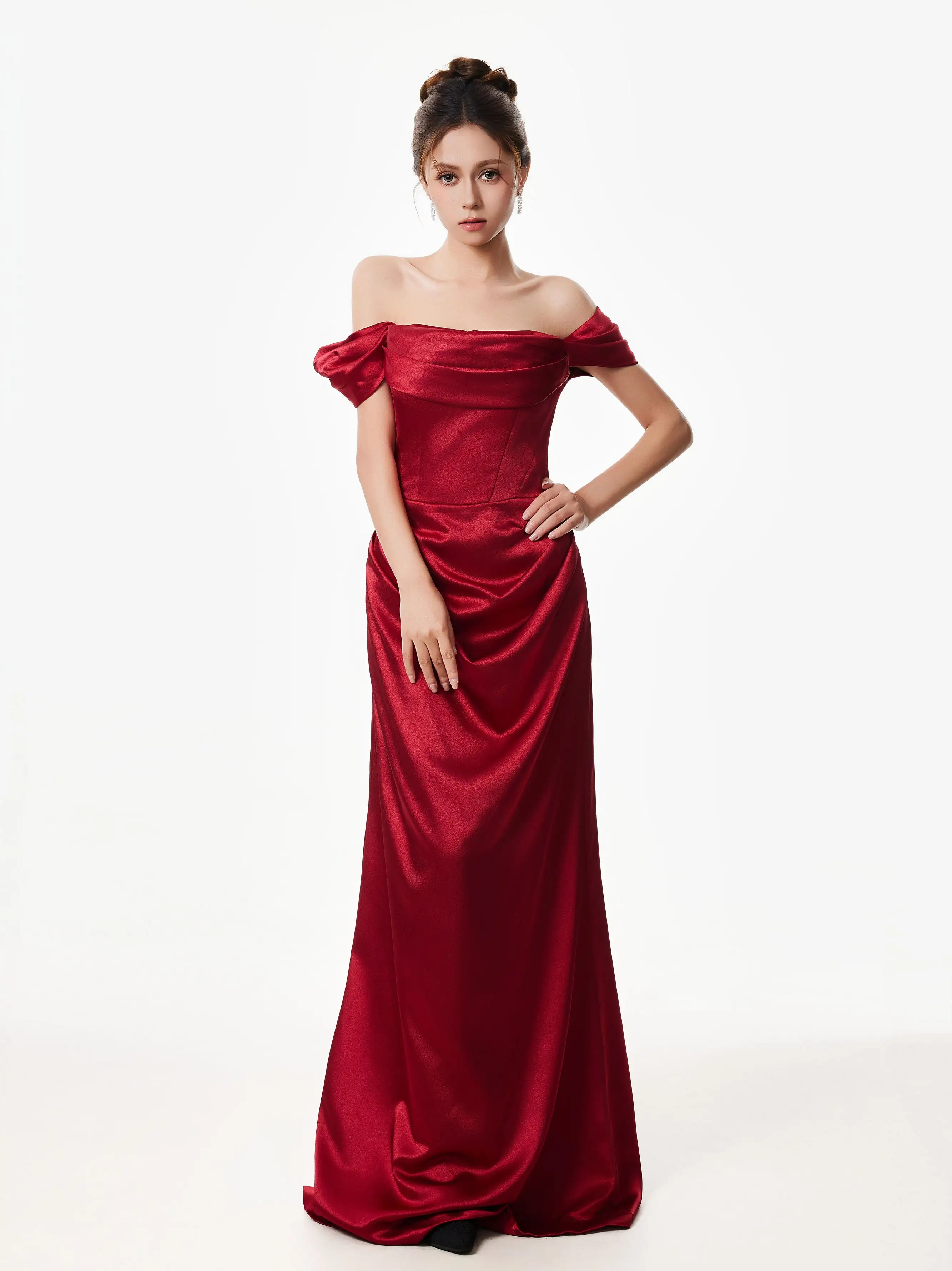 Crafted from a rich, smooth satin blend, the structured bodice and soft draping at the hips flatter your shape with ease. The off-shoulder cut adds a hint of drama without being over the top, while the fishtail hem gives the look quiet movement and a refined finish.
