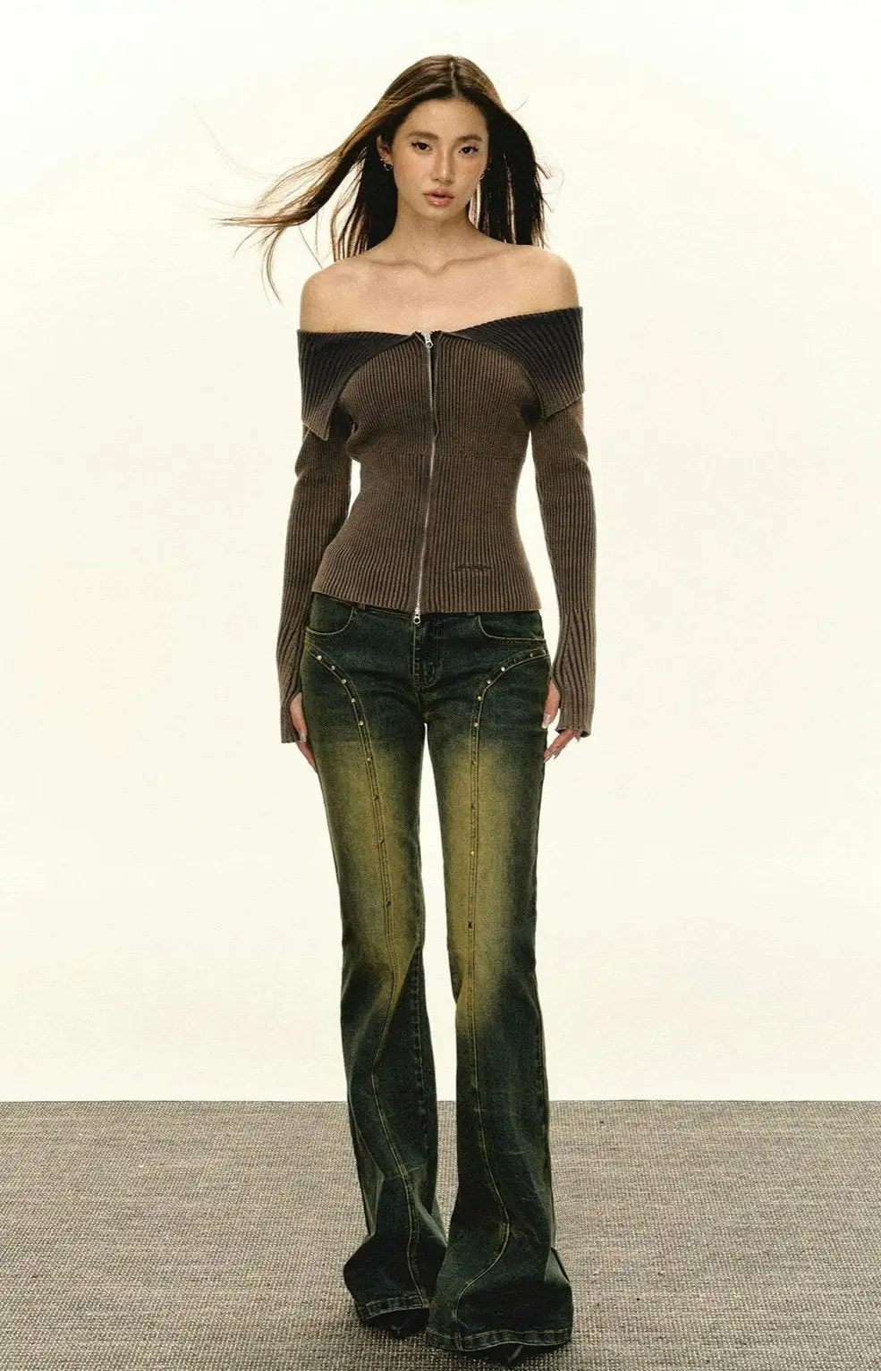 Revamp your wardrobe with the tactile allure of our Off-Shoulder Ribbed Gradient Knit Zip-up Sweater – a perfect blend of comfort and chic appeal.
