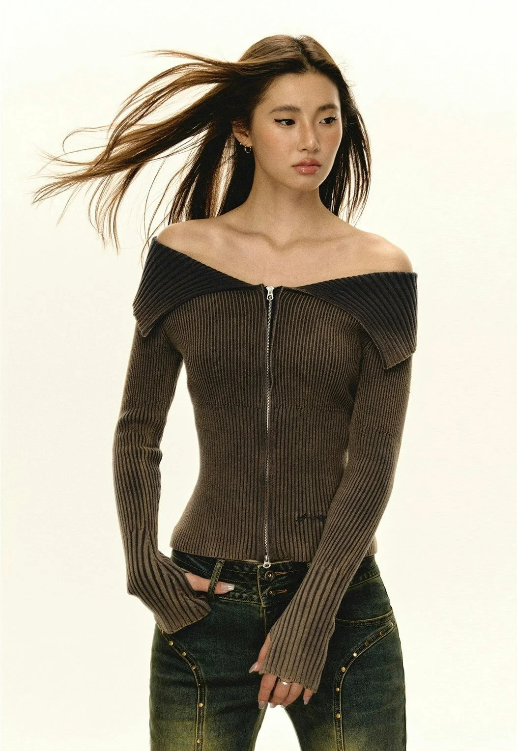 Off-Shoulder Ribbed Gradient Knit Zip-up Sweater