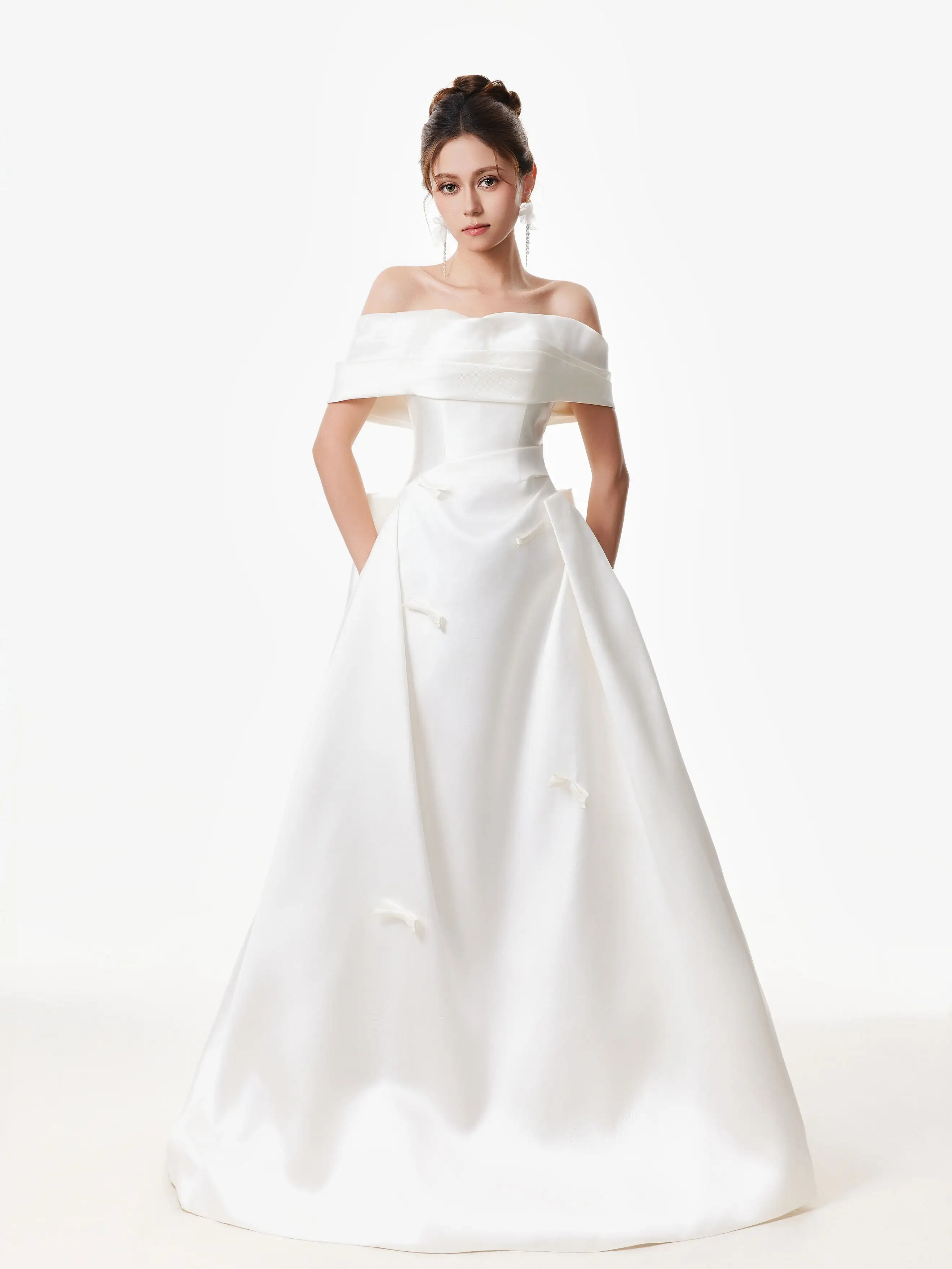 The off shoulder satin gown with draped bodice is the kind of piece that feels quietly elevated, without trying too hard. With its soft sheen and minimal detailing, this dress blends statement and simplicity in one clean silhouette.