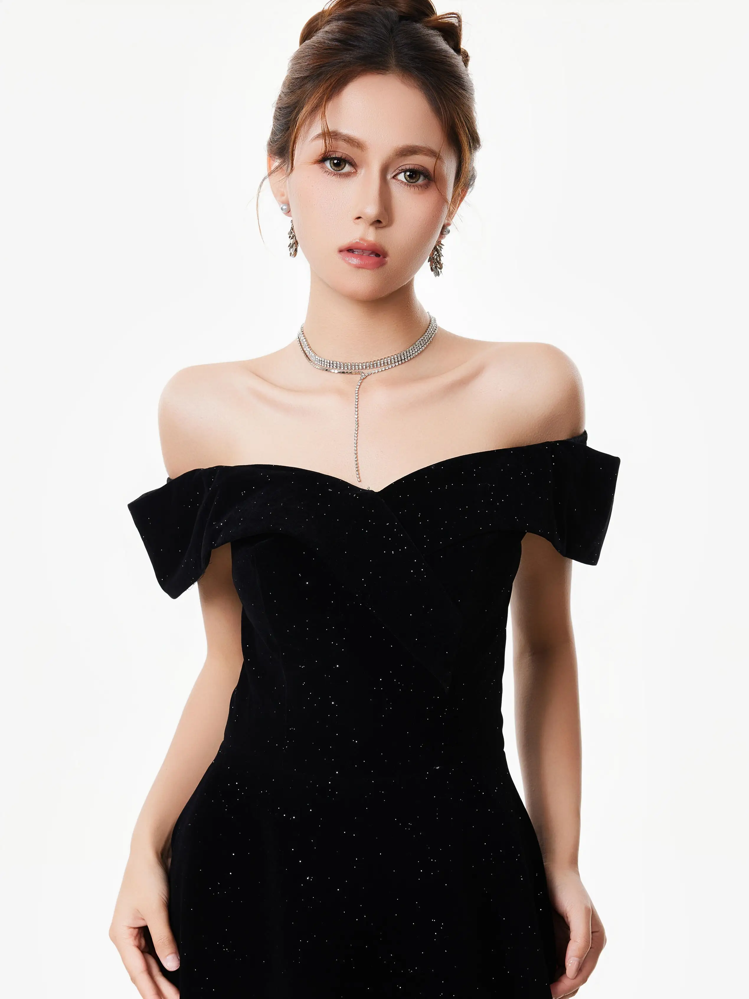 The off-shoulder velvet sparkle evening dress brings together soft texture and a subtle shimmer for a look that’s both refined and bold.