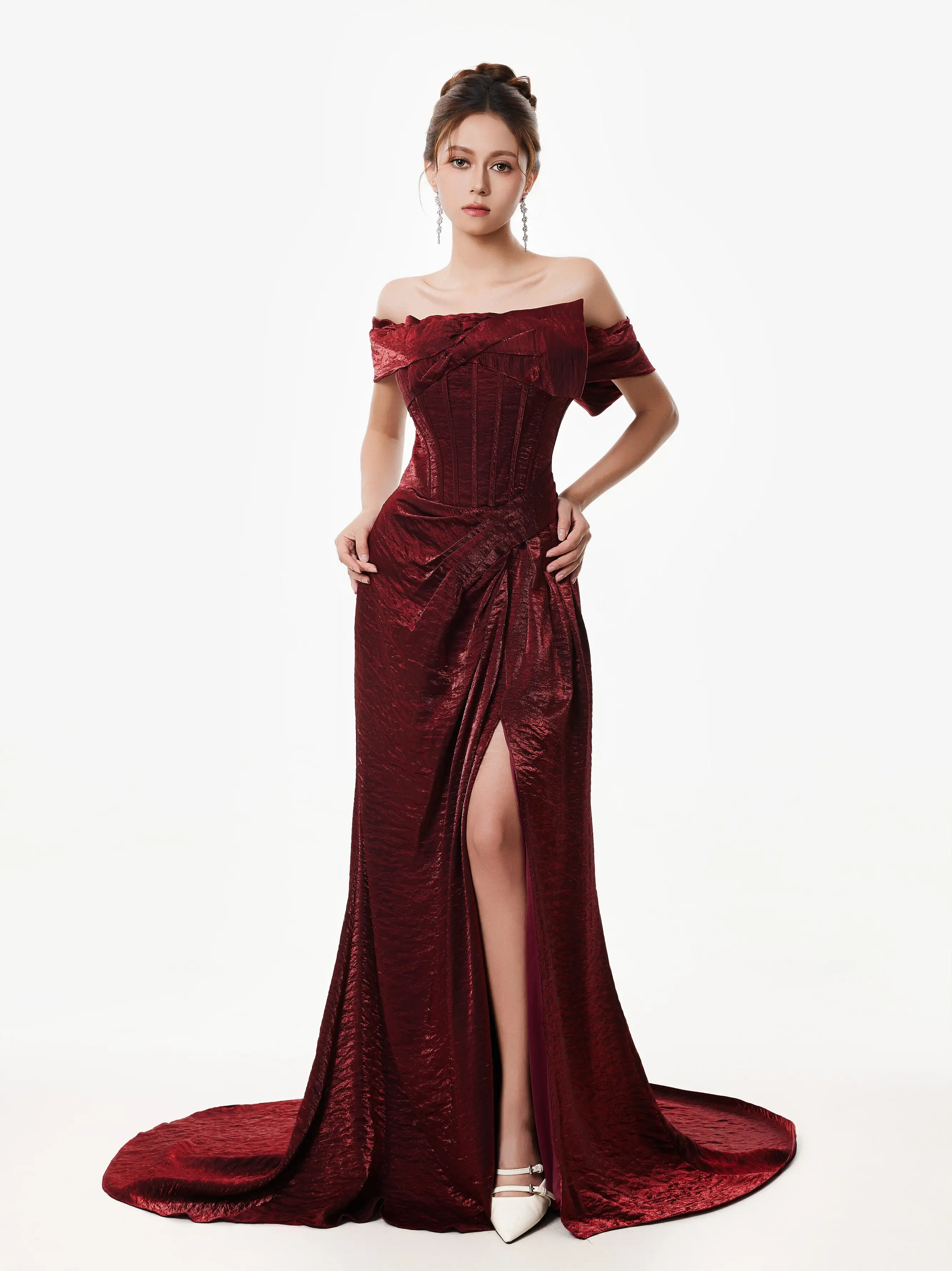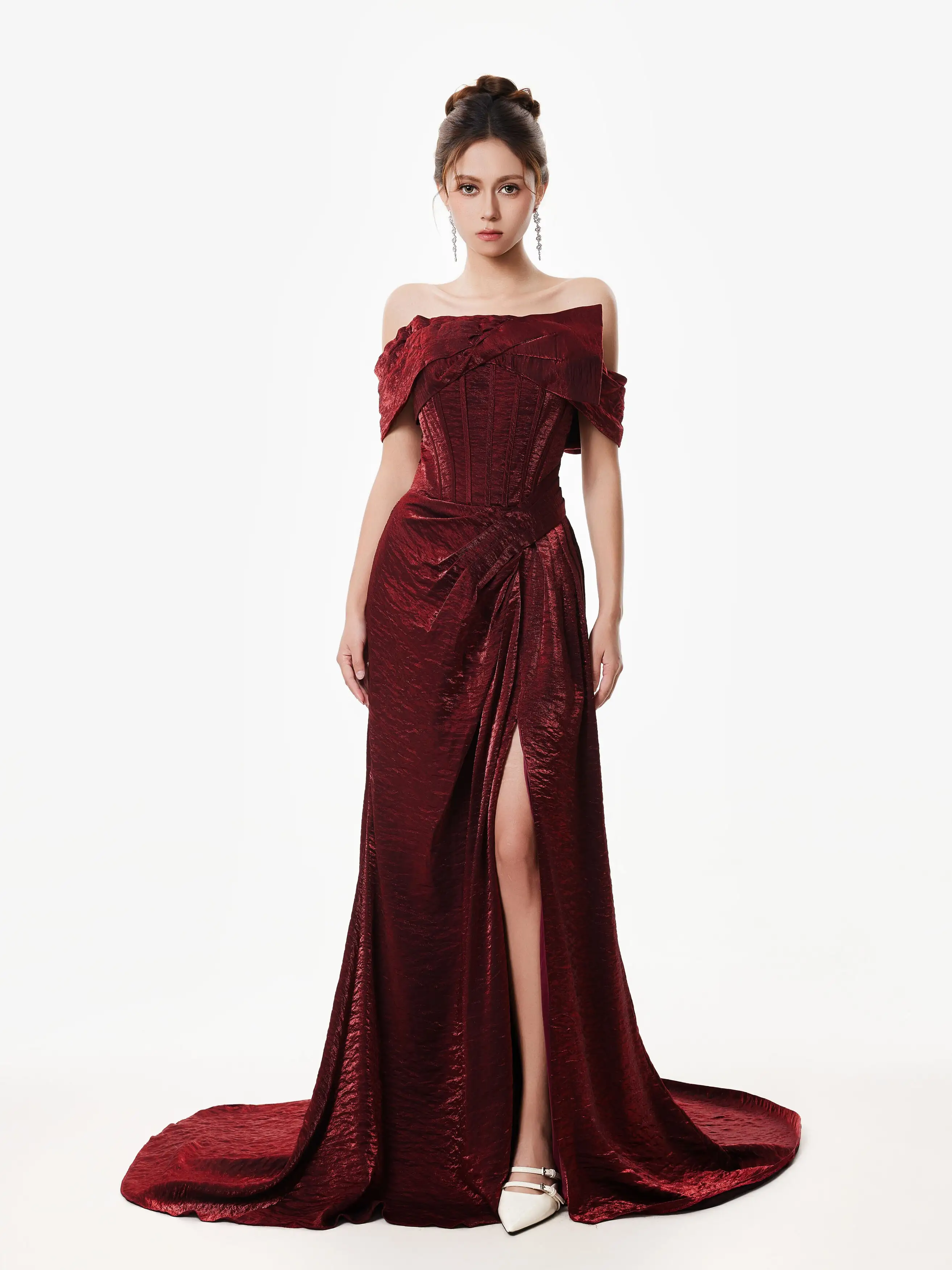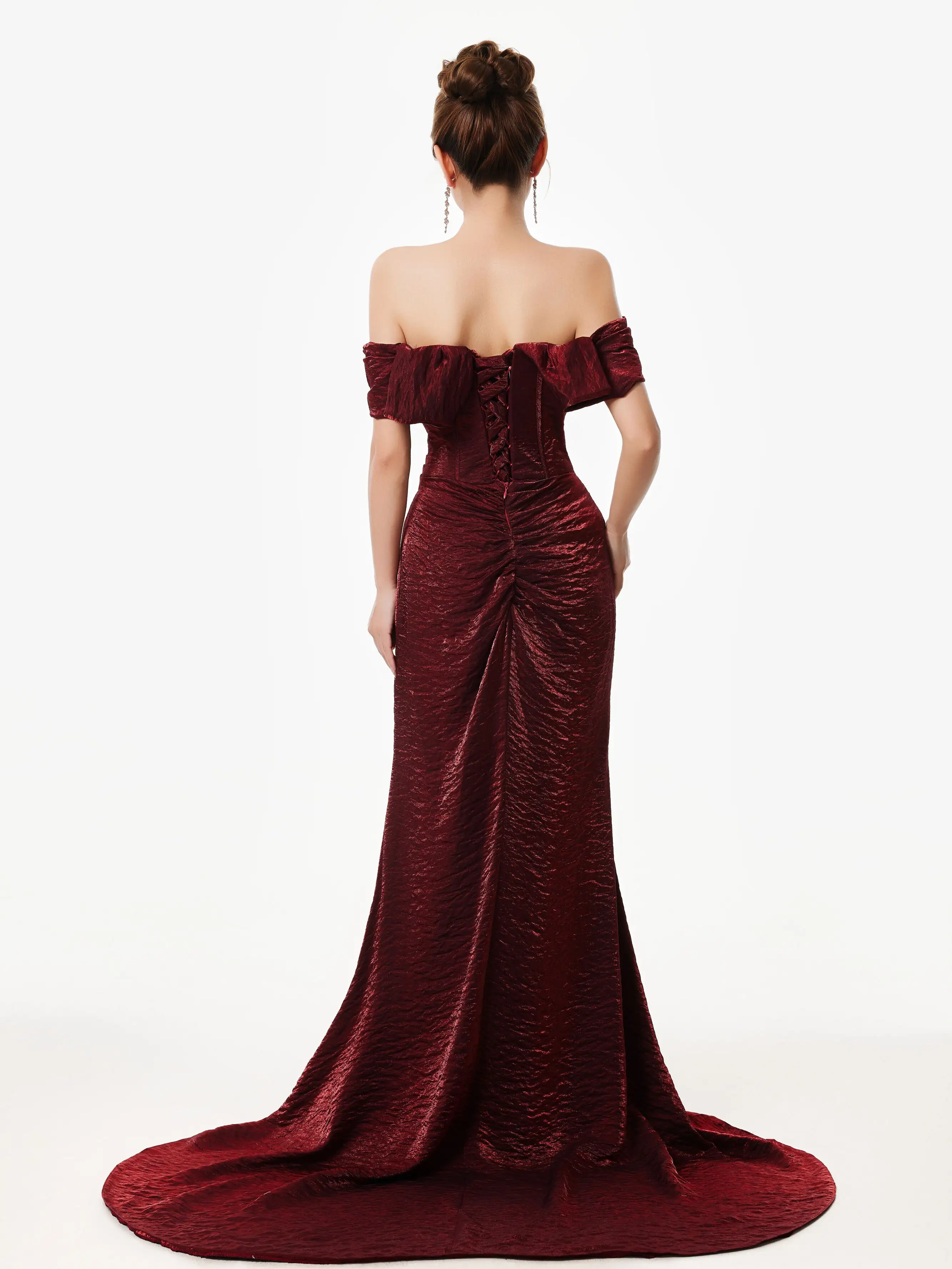 The off-shoulder fishtail silhouette and rich wine red tone give this corset dress a bold yet timeless appeal that stands out for all the right reasons. Designed to contour the body, it combines structure with romantic lines for a look that's equal parts striking and refined.