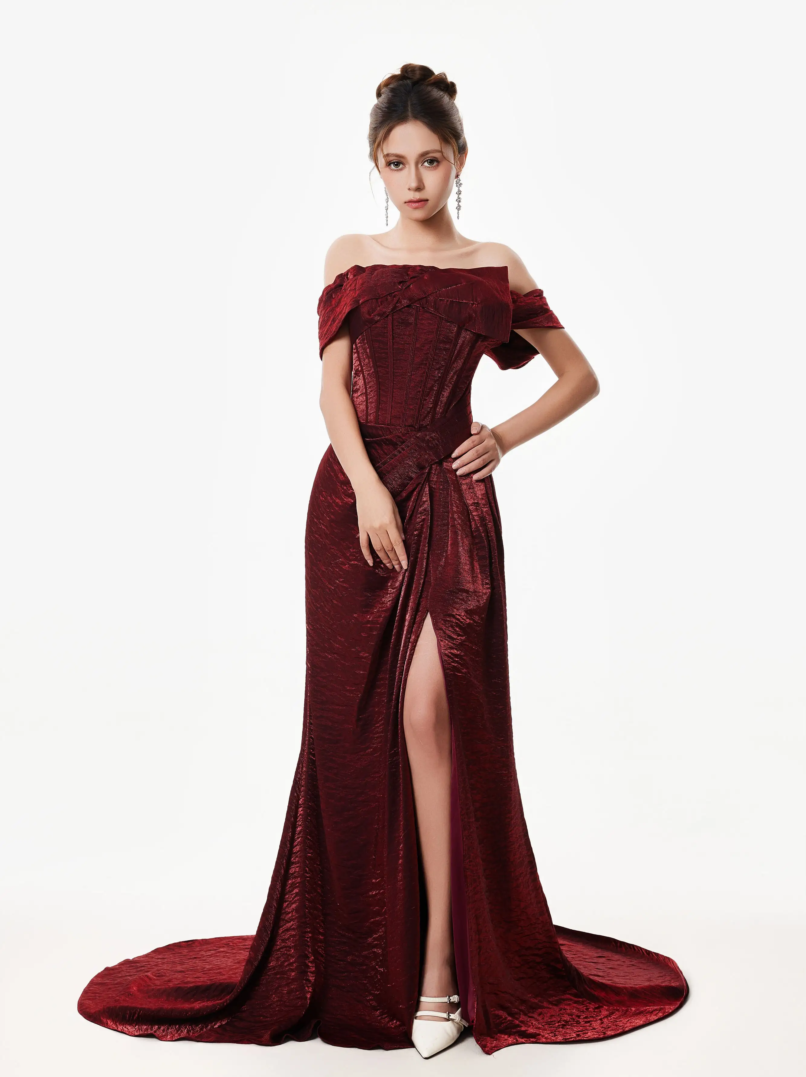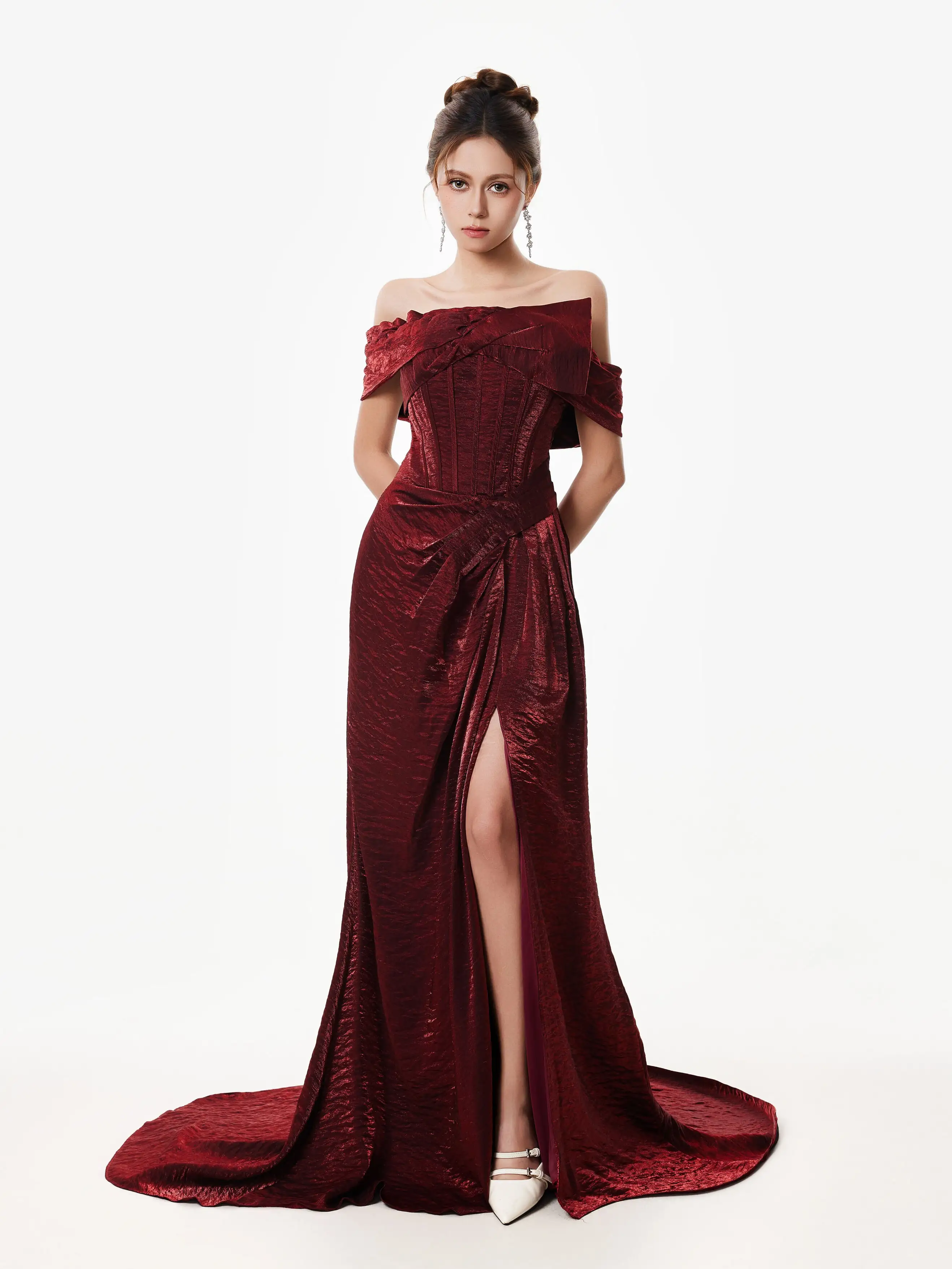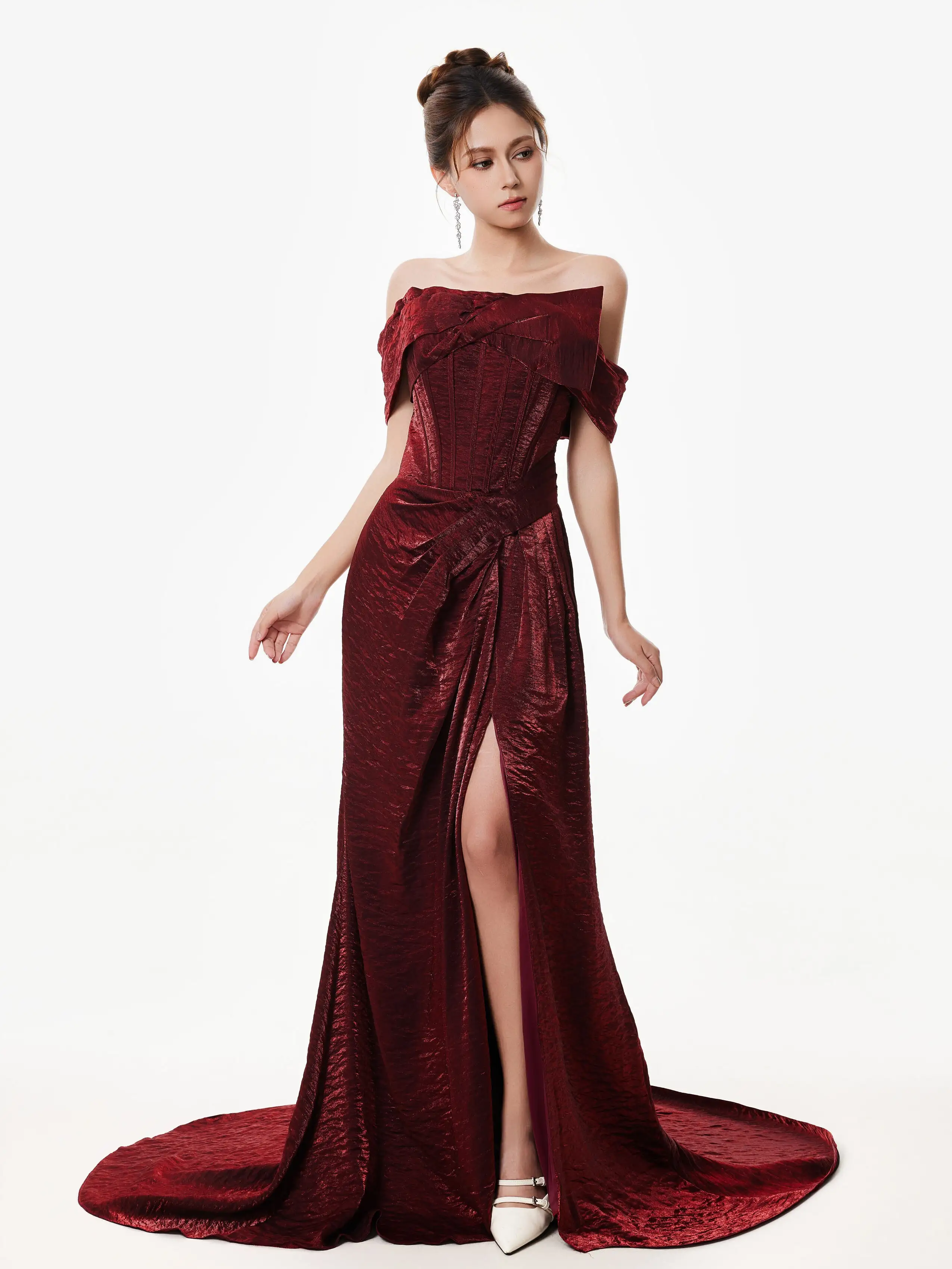 The off-shoulder fishtail silhouette and rich wine red tone give this corset dress a bold yet timeless appeal that stands out for all the right reasons. Designed to contour the body, it combines structure with romantic lines for a look that's equal parts striking and refined.