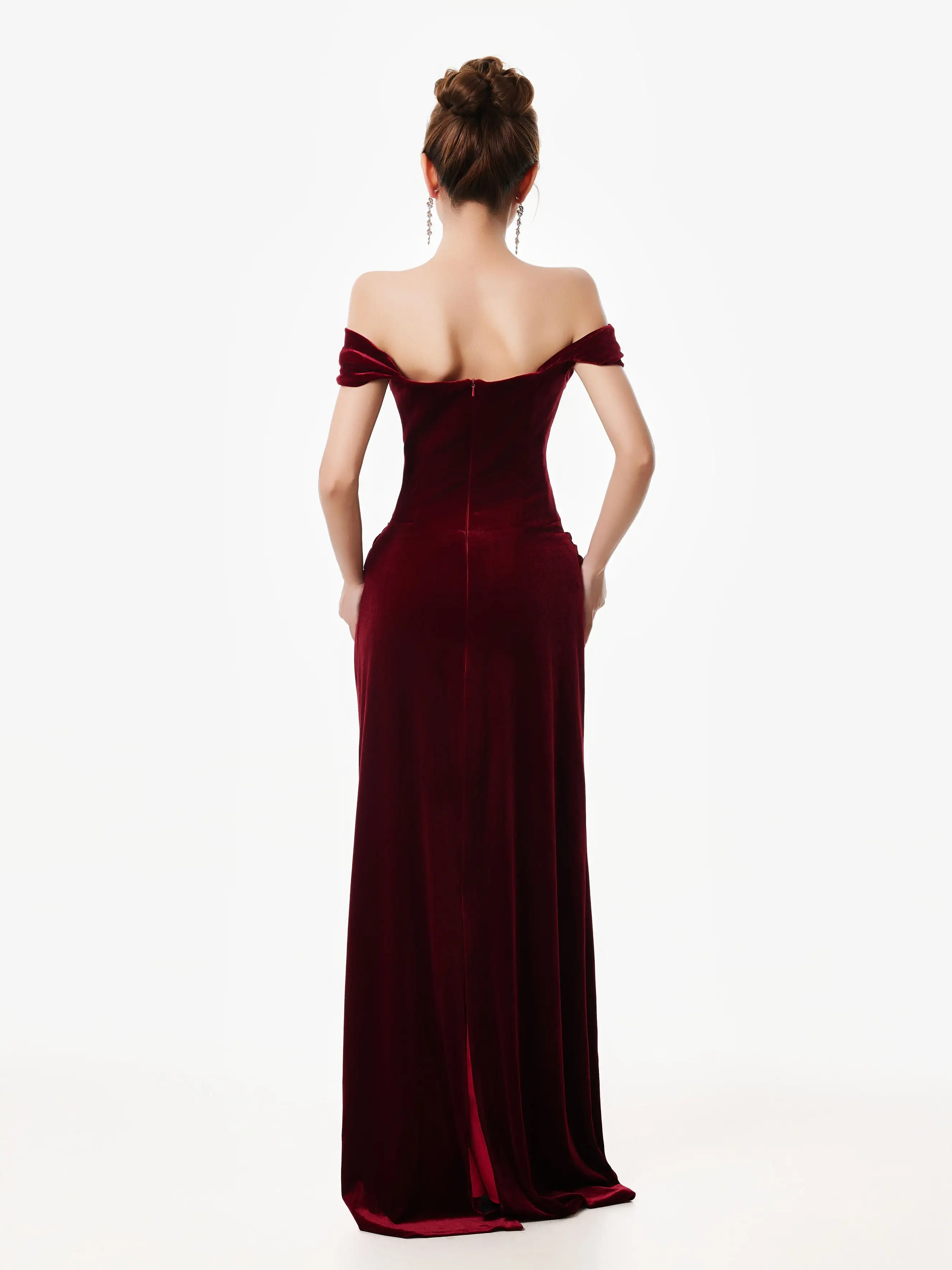Crafted from a rich, smooth velvet material, the structured bodice and soft draping at the hips flatter your shape with ease. The off-shoulder cut adds a hint of drama without being over the top, while the fishtail hem gives the look quiet movement and a refined finish.