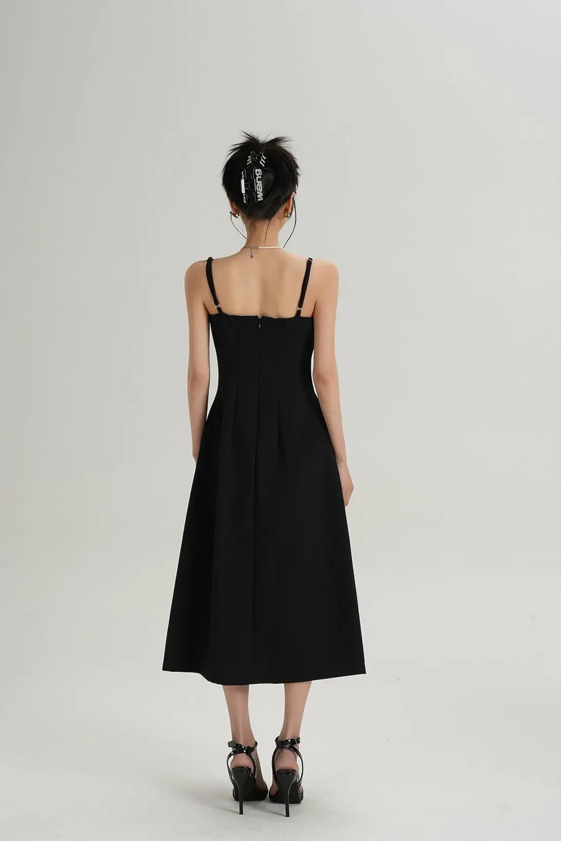 A structured take on an effortless silhouette, this pleated spaghetti strap midi dress blends sharp tailoring with fluid movement.