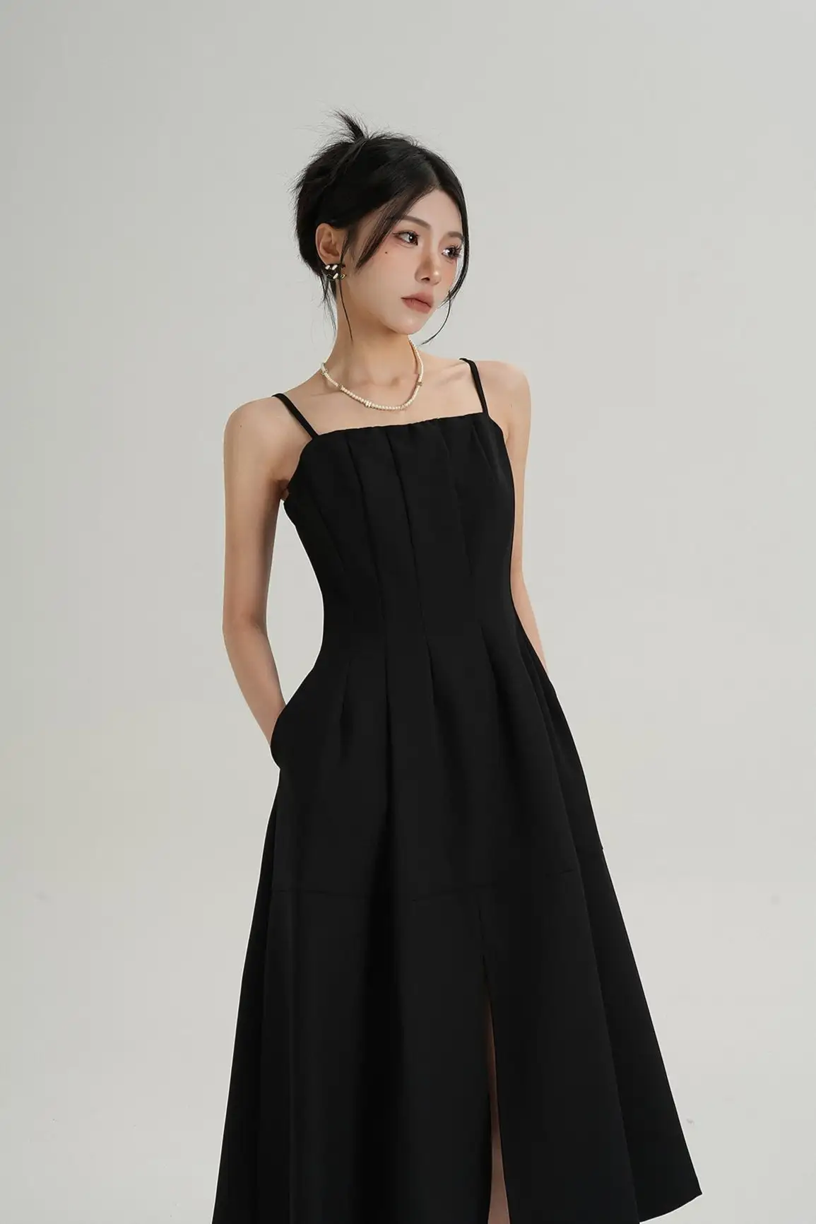 The front slit adds just the right touch of attitude, letting you move with ease while making a statement. Crafted from a smooth, mid-weight fabric with a subtle sheen, the pleats create a sculpted effect that flatters the body without feeling restrictive. The high waistline enhances the shape, while the adjustable spaghetti straps provide a customizable fit.