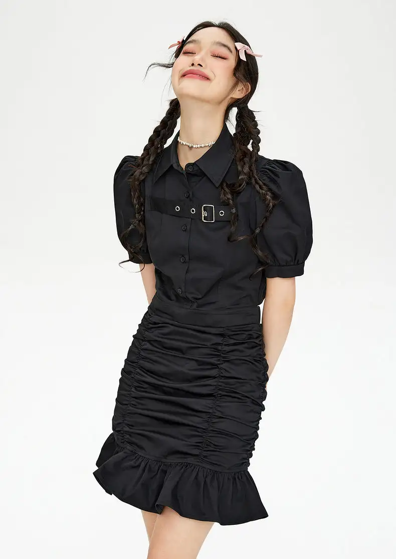 With its ruched detailing and ruffle hem, this piece plays with texture and shape, creating a look that feels both put-together and undone. The fitted silhouette highlights your natural shape, while the belt detail adds a sense of refinement. Made from a soft cotton blend, this dress is breathable and comfortable while maintaining its sleek structure. The puff sleeves give it a subtle statement, making it easy to style up or down.