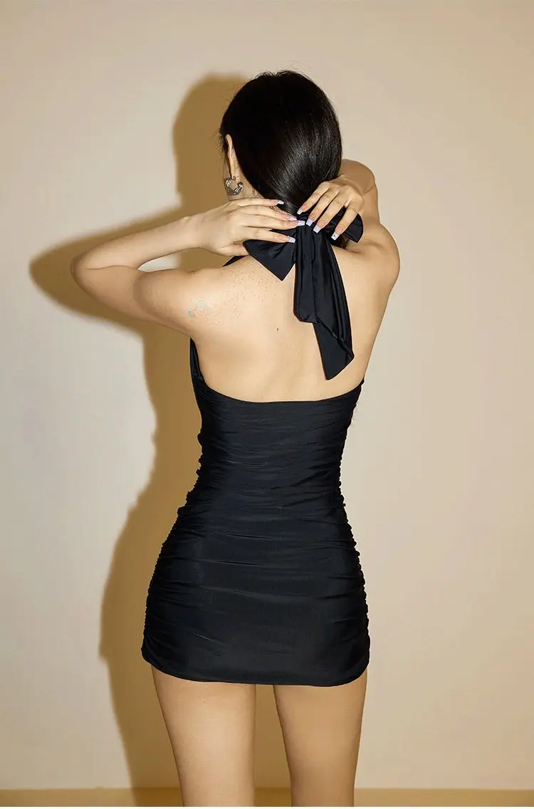 Crafted from quality material, our swimdress features a flattering ruched silhouette and a playful bow neck halter, ensuring both style and comfort. The integrated soft cup padding provides support, while the ruching detail adds a touch of sophistication, making it perfect for any poolside or beach occasion.