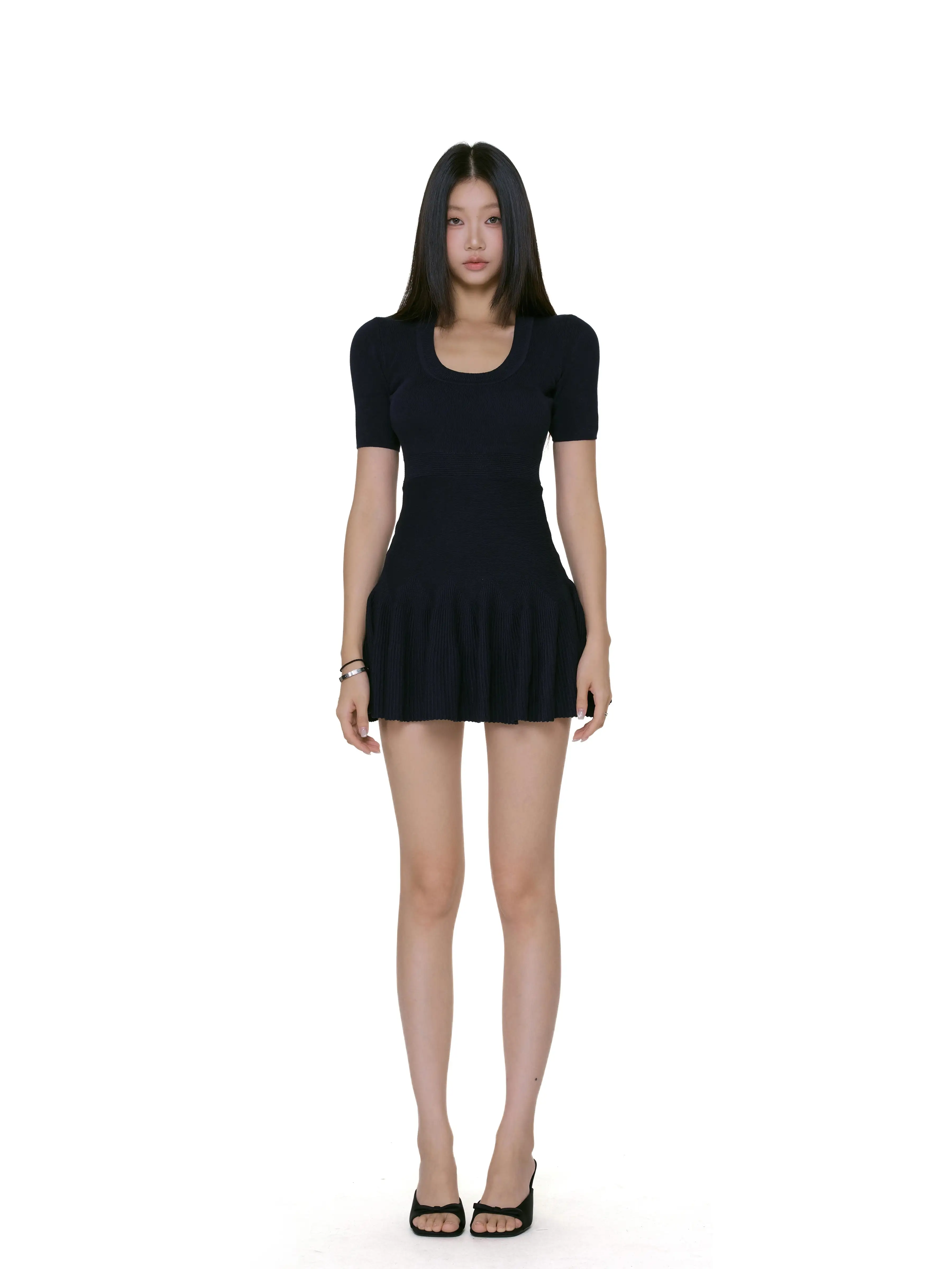 The fitted waist and subtle flare at the hem give it structure without feeling overdone. Crafted in a ribbed knit fabric that offers mild stretch, it hugs in the right places while holding its shape throughout the day. The clean U-neckline and short sleeves keep things balanced, making it a go-to for casual nights out, city errands, or lazy brunch hours.