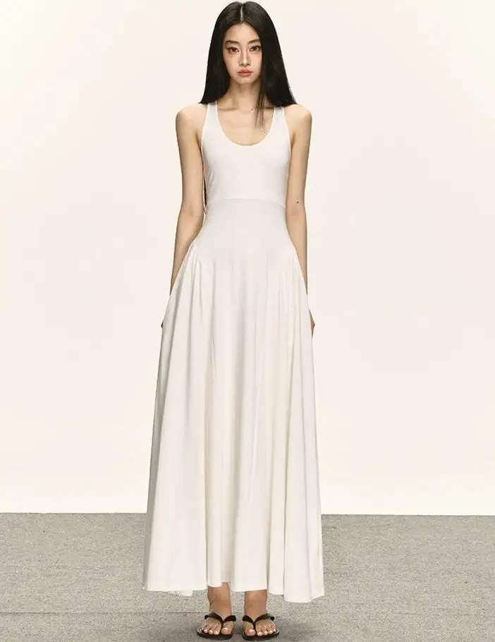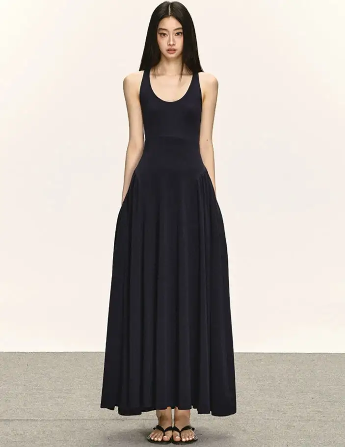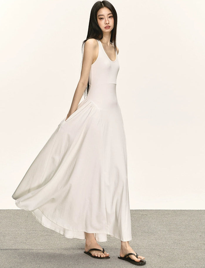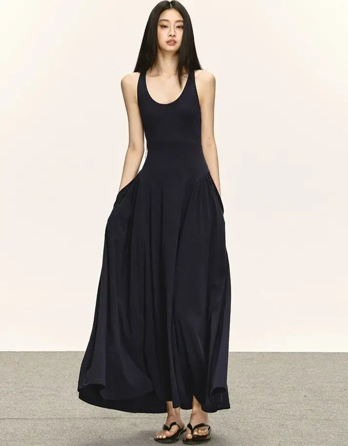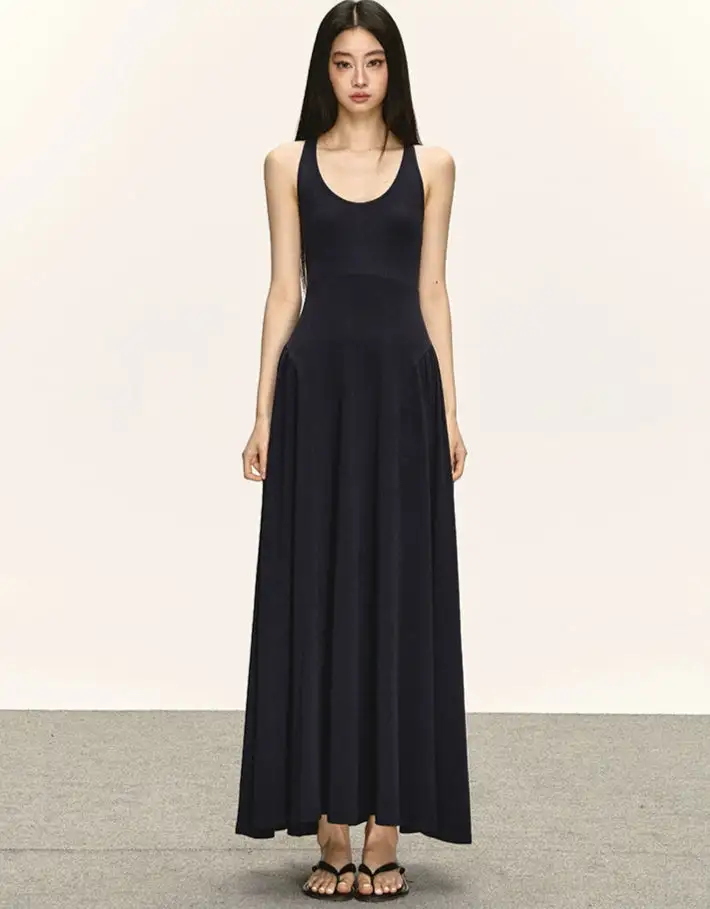 Crafted from a soft yet structured blend of viscose, cotton, and spandex, this long dress features a high waist and U-neckline for a sleek, sculpted fit. The smooth, solid finish keeps things minimal while the racer-style back and curved cut-out make it stand out without trying too hard.
