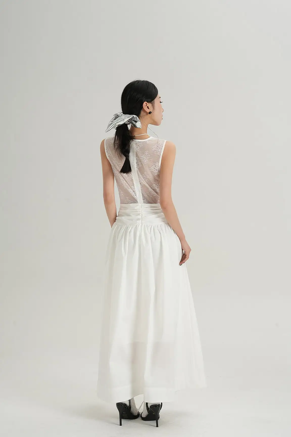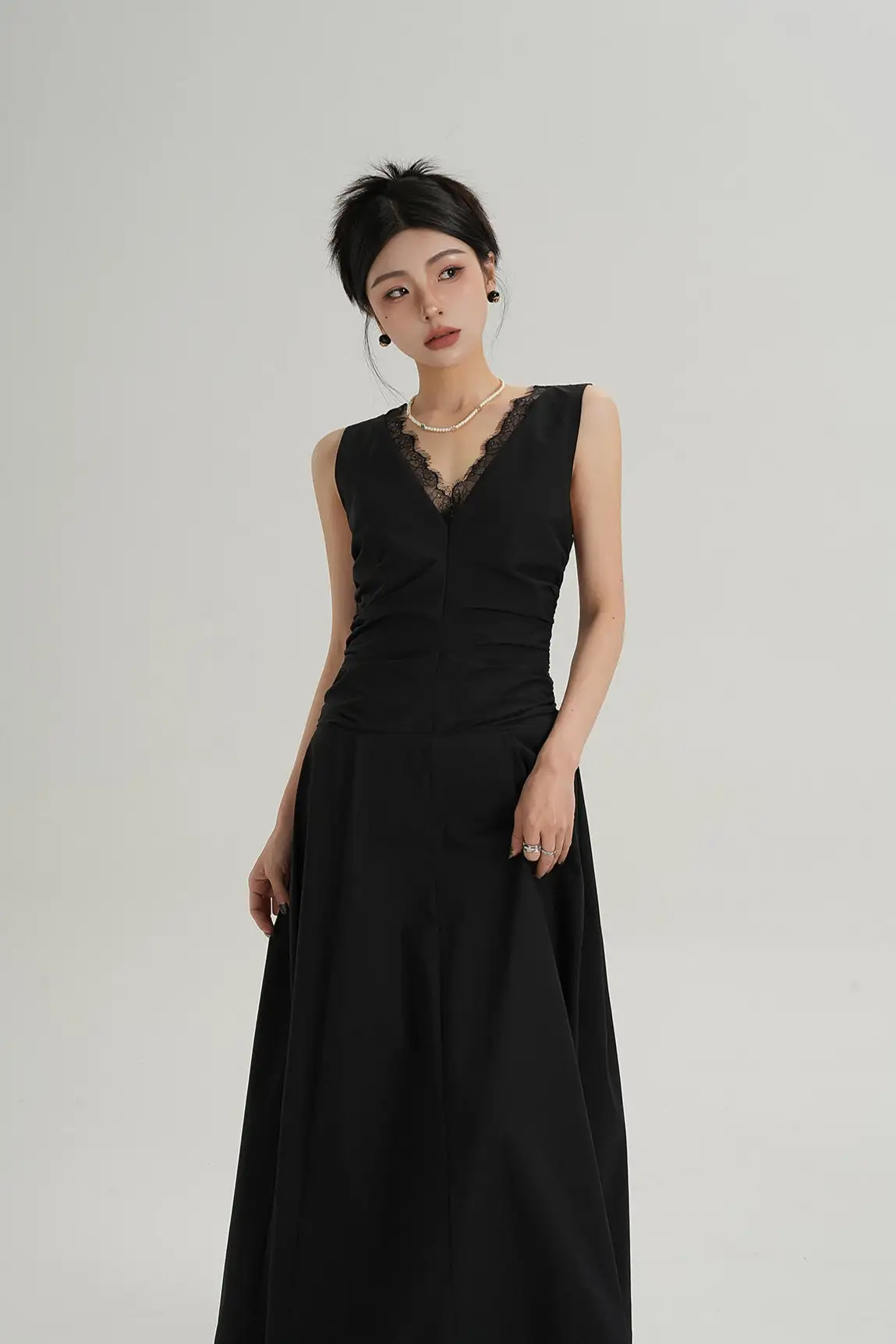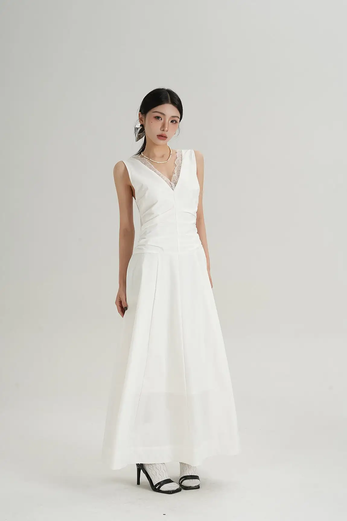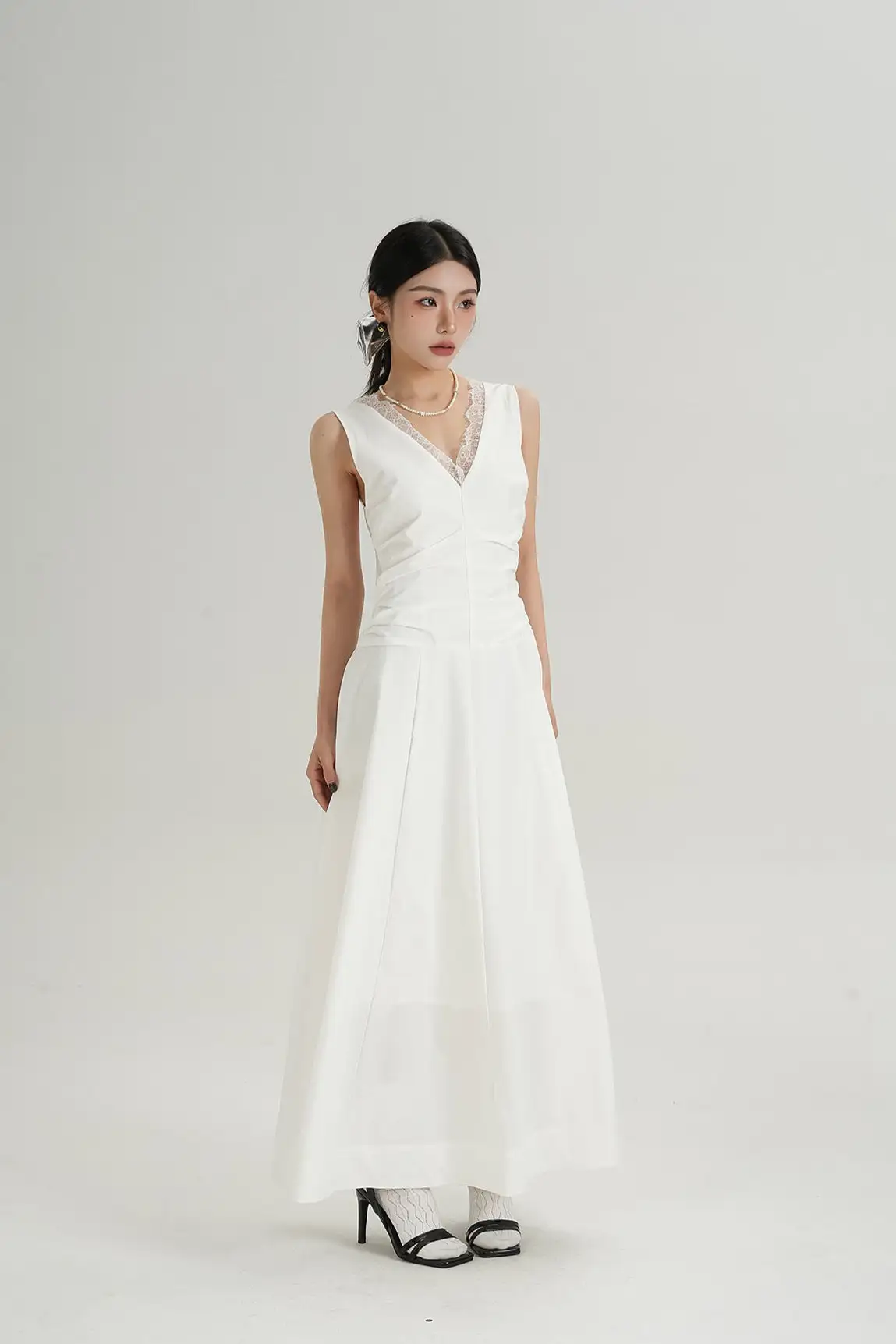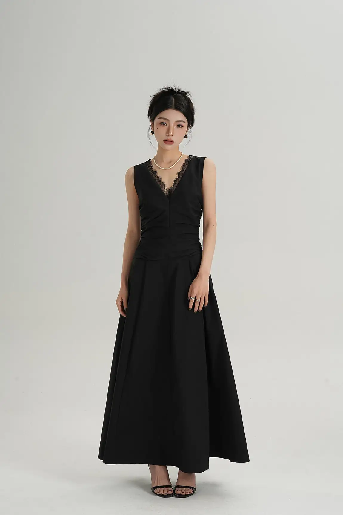 Sleeveless V-Neck Maxi Dress with Lace Back and Ruched Waist
