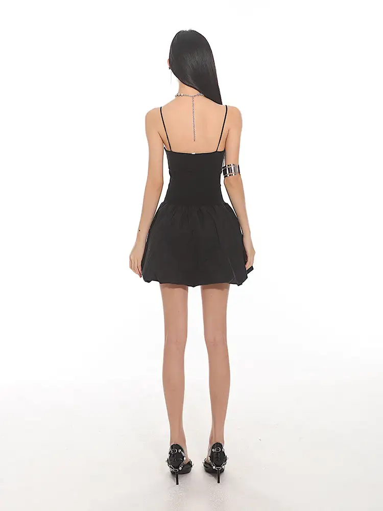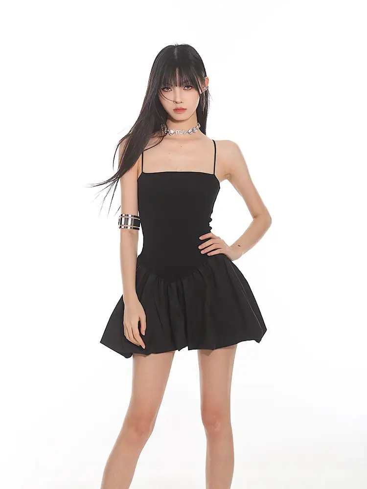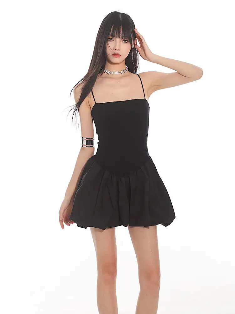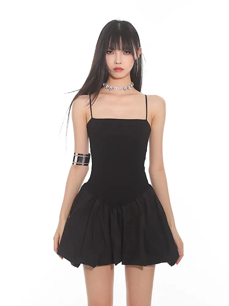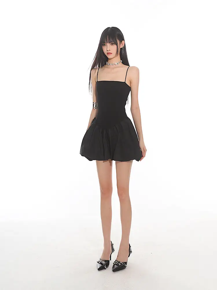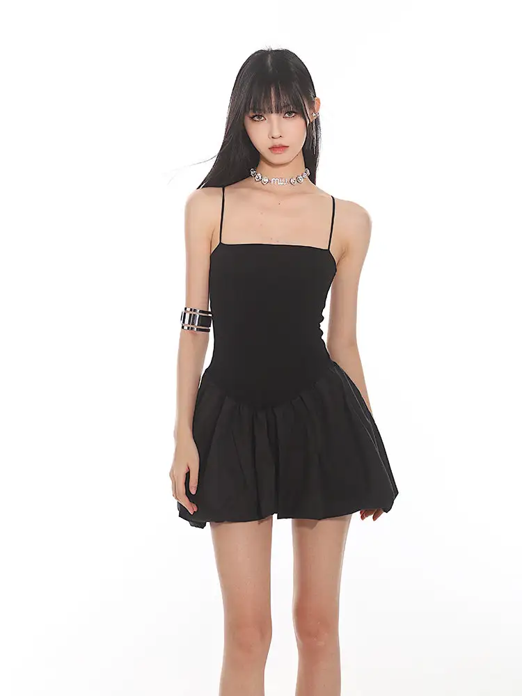 Constructed for comfort and style, this dress features a fitted bodice with slender spaghetti straps leading to a playful, pleated bubble skirt that exudes a sense of edgy, nonchalant elegance. The sleek and stretchy material ensures a figure-flattering silhouette, while the dress's versatile cut makes it suitable for both daytime adventures and evening escapades.