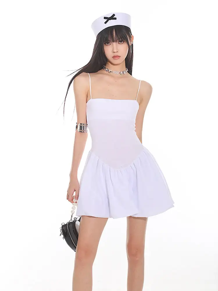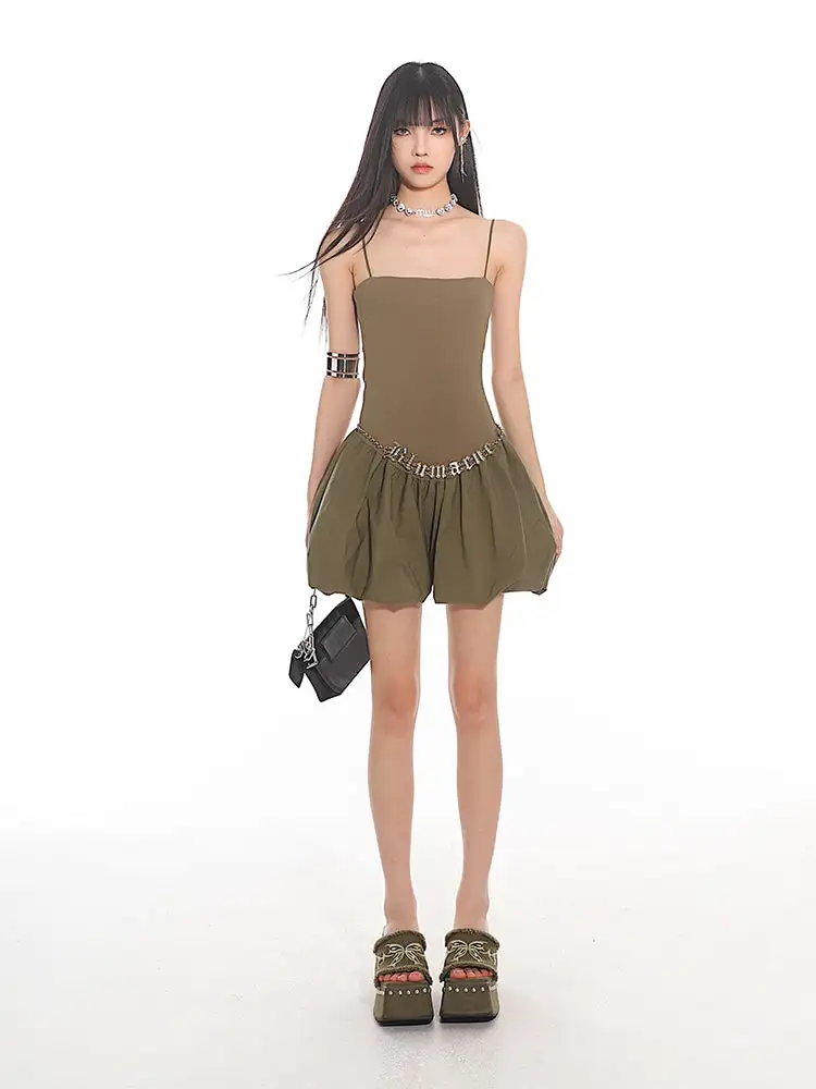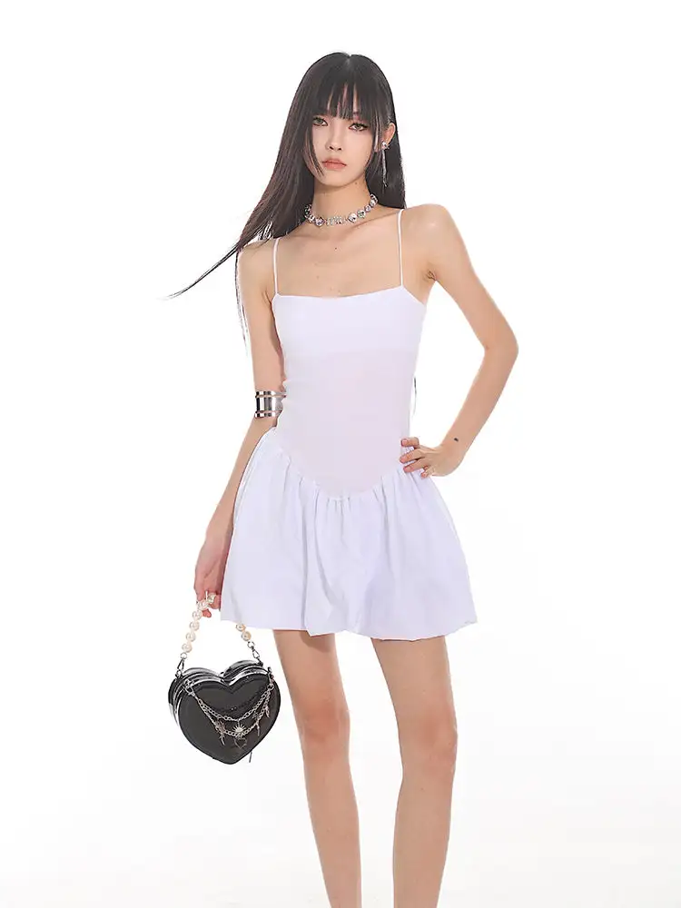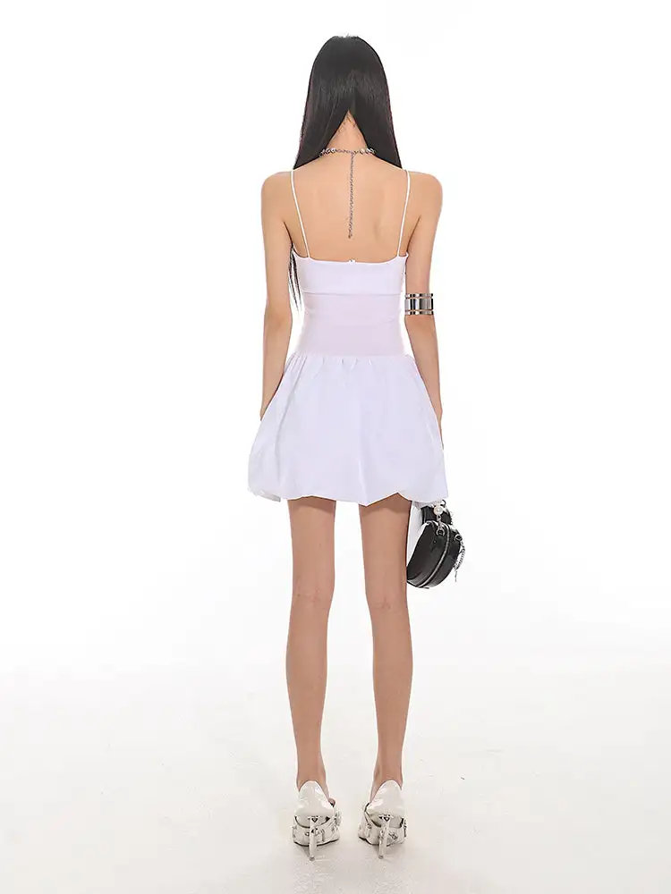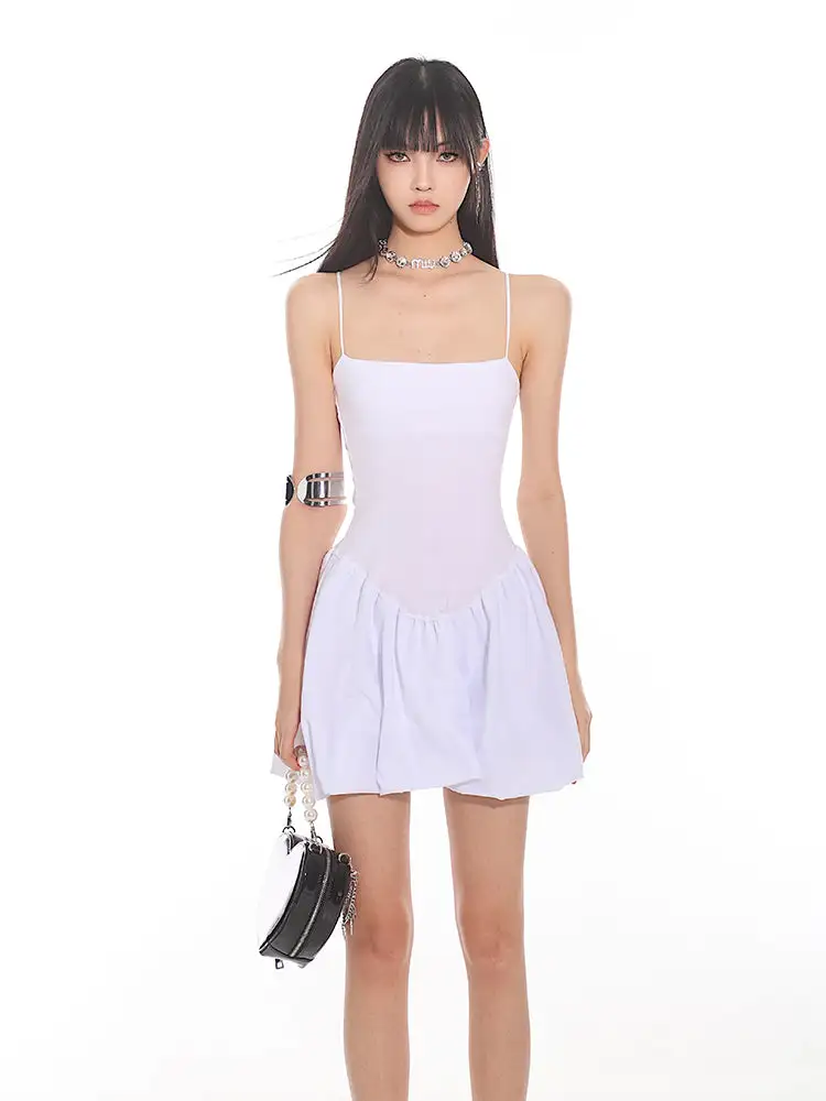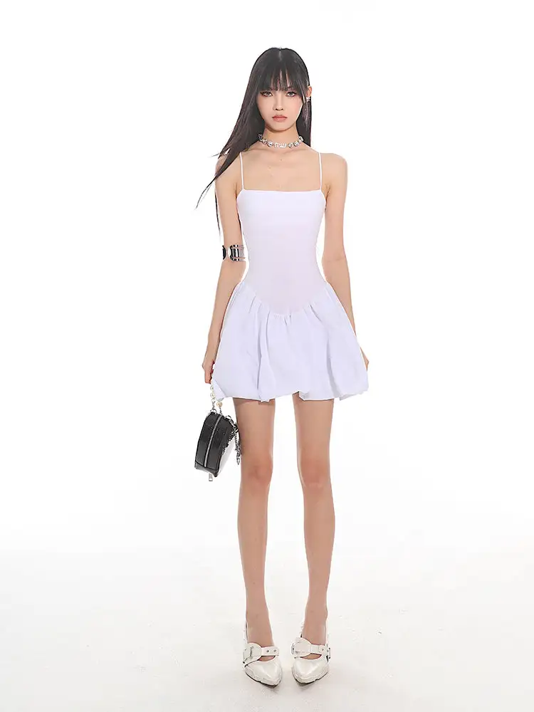 Constructed for comfort and style, this dress features a fitted bodice with slender spaghetti straps leading to a playful, pleated bubble skirt that exudes a sense of edgy, nonchalant elegance. The sleek and stretchy material ensures a figure-flattering silhouette, while the dress's versatile cut makes it suitable for both daytime adventures and evening escapades.