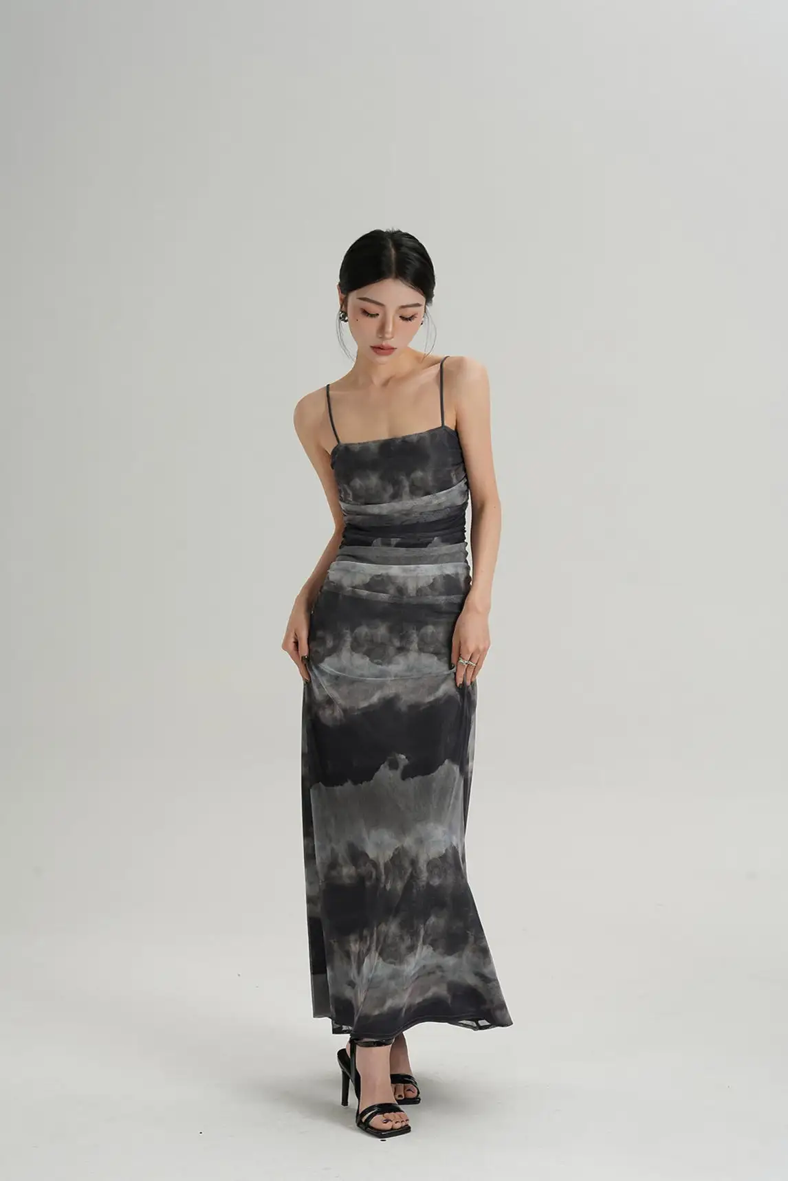 The fluid silhouette hugs in all the right places, while the moody ink-wash print adds a distinct, artful edge. A fitted bodice with delicate ruching enhances the waist, creating a sleek, confident shape that stays comfortable all day. Crafted from a soft, lightweight fabric with a slight sheen, this dress drapes beautifully on the body without feeling restrictive. Adjustable spaghetti straps allow for a customized fit, while the wrinkle-textured design gives it a natural, undone look.