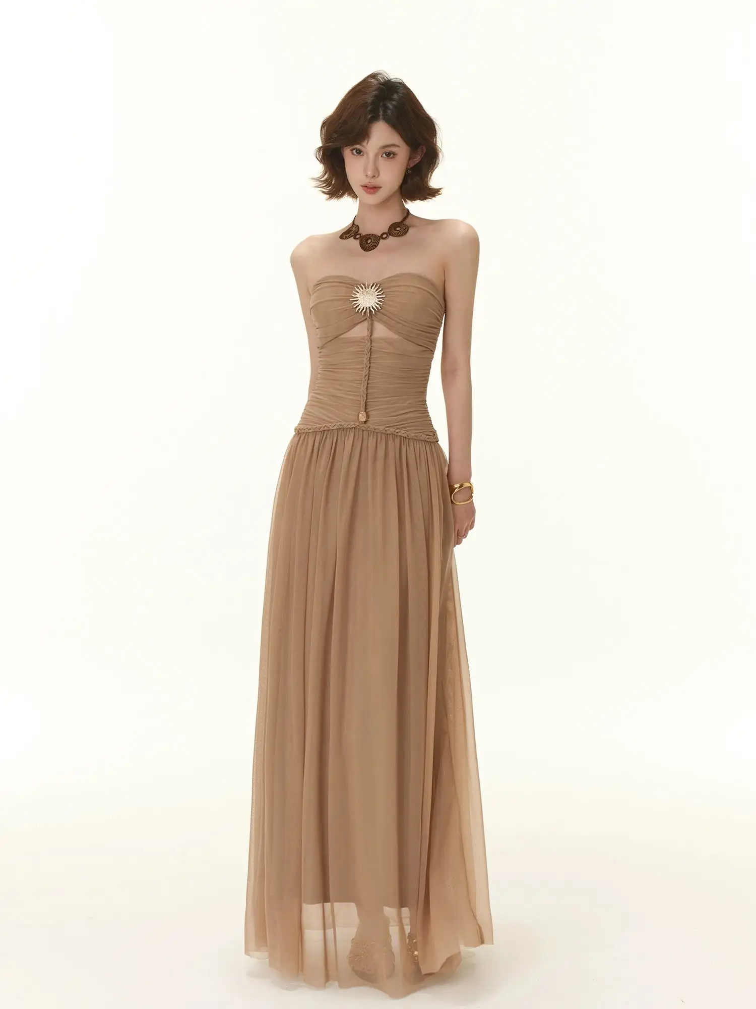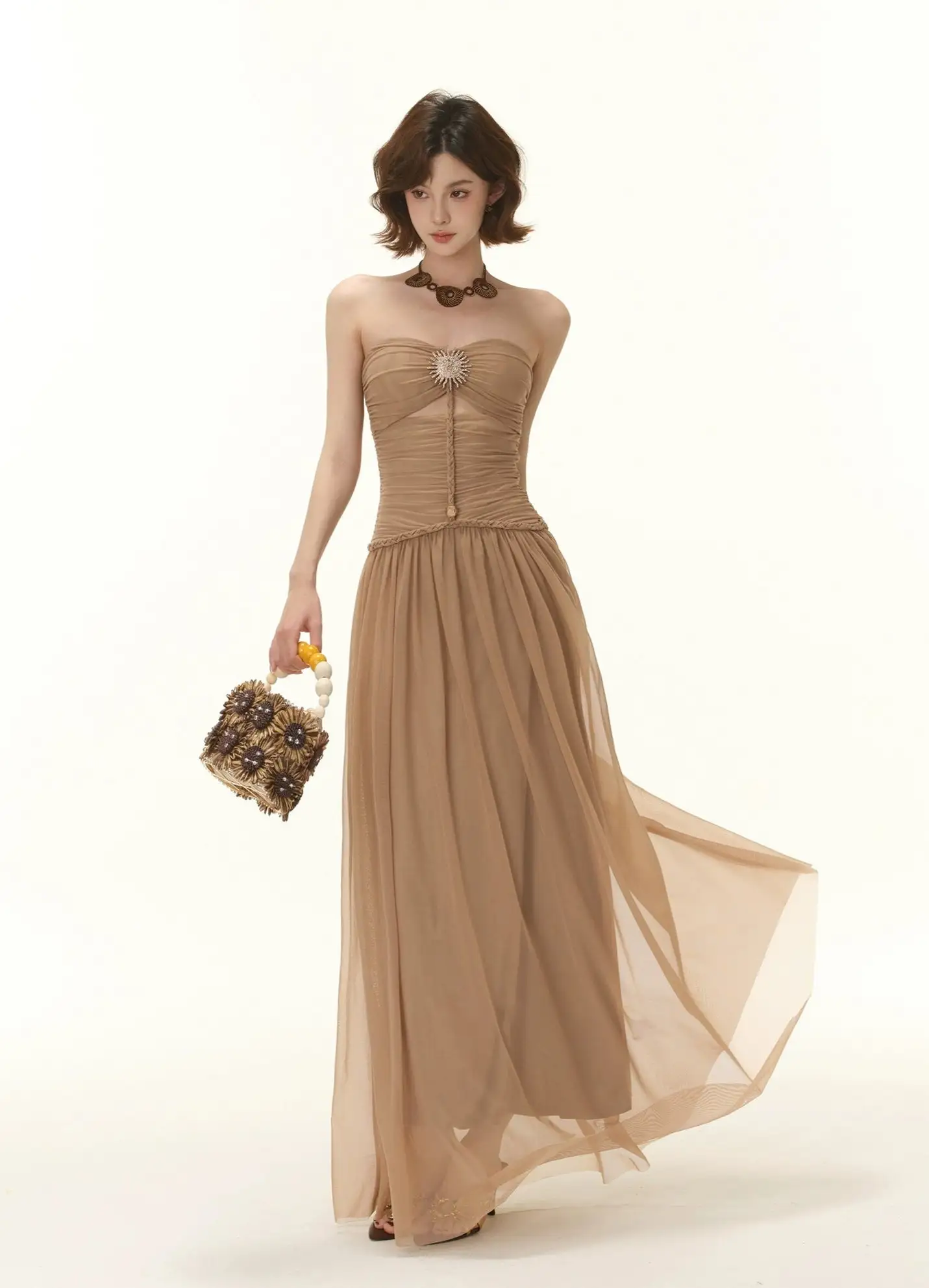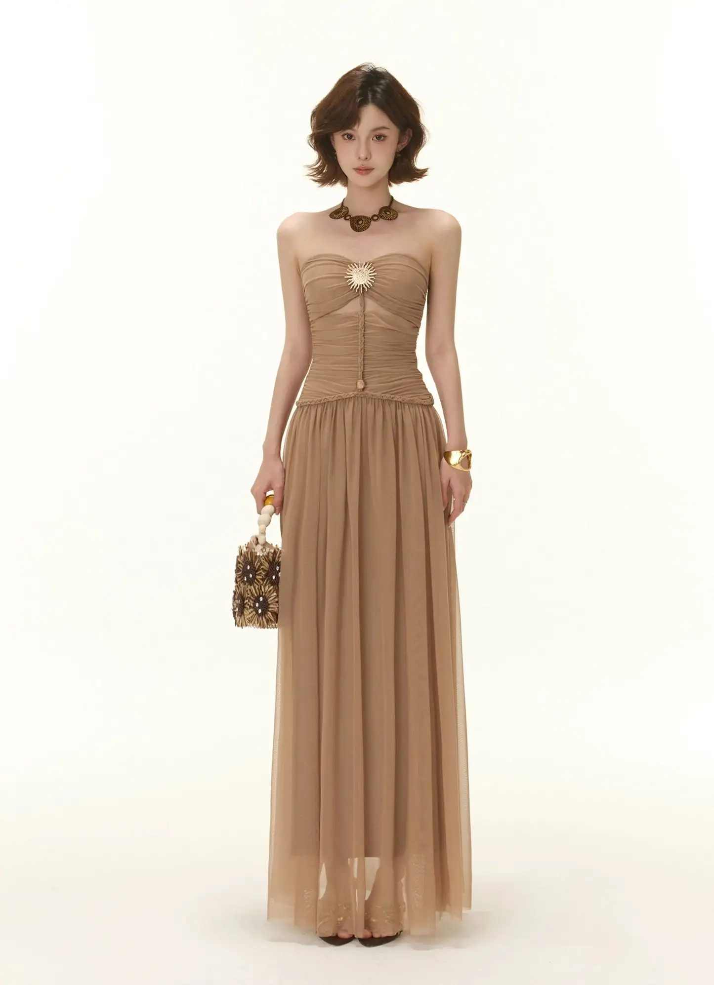This strapless ruched maxi dress stands out with its free-flowing sheer overlay and sculptural brooch detail, giving it an understated edge that doesn't try too hard.